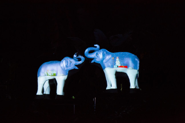 Returning in a new spot this year are the fabulously cool 3D projections on elephant statues which morph between elephants strung with holiday lights, wearing sweaters, or covered with holiday wrapping paper.