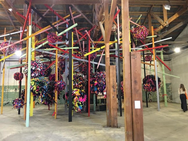 The artist’s The Young Prince Of The Forest Breaks Wind features Bambi, butterflies, a caterpillar, and the word “Resurrection.” Bambi farts butterflies, which may also have emerged from the caterpillar transformed; a thickly antlered ancestor perches near the Rainbow Bridge, while flowers, a fairy, and skulls co-exist. On either side of the shadowbox, two large, candelabra-like holders contain deer hooves with fringed tops, which take the place of candles. These ersatz candles frame what is essentially an altar to change, metamorphosis, and the taboo yet entirely natural functions of death, passing wind, and growing up.