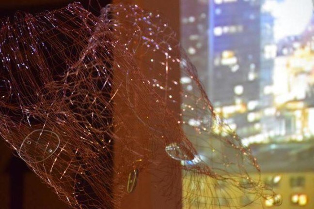 Art Slant’s Round 5 awarded DANI DODGE, NIGHT CLOUDS, 2016, an installation which explores the natural wonder of clouds, interpreted by Dodge through a stunningly delicate weave of fishing line and copper wire, containing not rain but prescription eyeglass lenses which serve to reflect the dancing, sparkling projected images of stars, and emotionally, the viewers perceptions of night, clouds, nature, life, and our own perceptions. This site specific piece is on view through August 13th at HB Punto Experimental in San Diego.