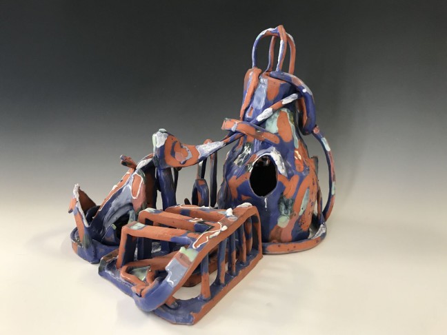 Alina Hayes creates sculptural forms grounded in traditional studio pottery technique. Using porcelain, lusters, decals, and glaze. and contrasting texture, color, and form, Hayes creates voluptuous, sinuous work in her “Carry Me” series, while in other works the glaze she uses is almost opalescent, shimmering and glowing, creating the look of liquid frozen in a single breath.