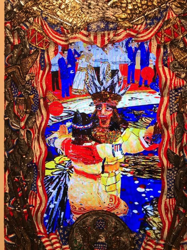 Among the most overtly political – and the most whimsical – were the lively works of Federico Solmi at L.A.’s Luis de Jesus booth, above. Animated video on plexiglass with gold leaf, silver leaf, and acrylic, the images were dazzling and delightful, even as they offered a pungent commentary on the 45th president, above, “The Eminent Manipulator” in his inaugural dance.