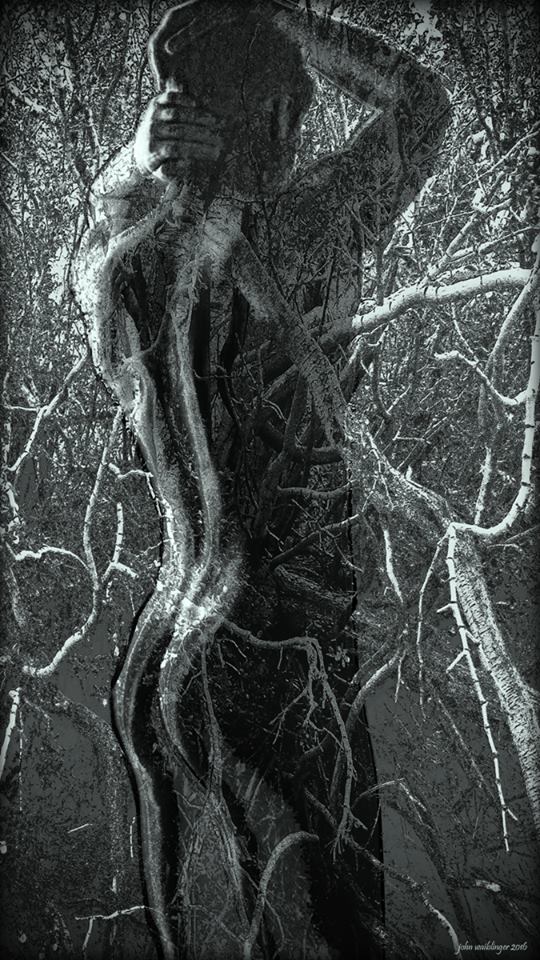 “Rooted” obscures this black and white image of a nude man, back turned to the viewer, with the branches of pale trees, almost fusing his spine to the branches.