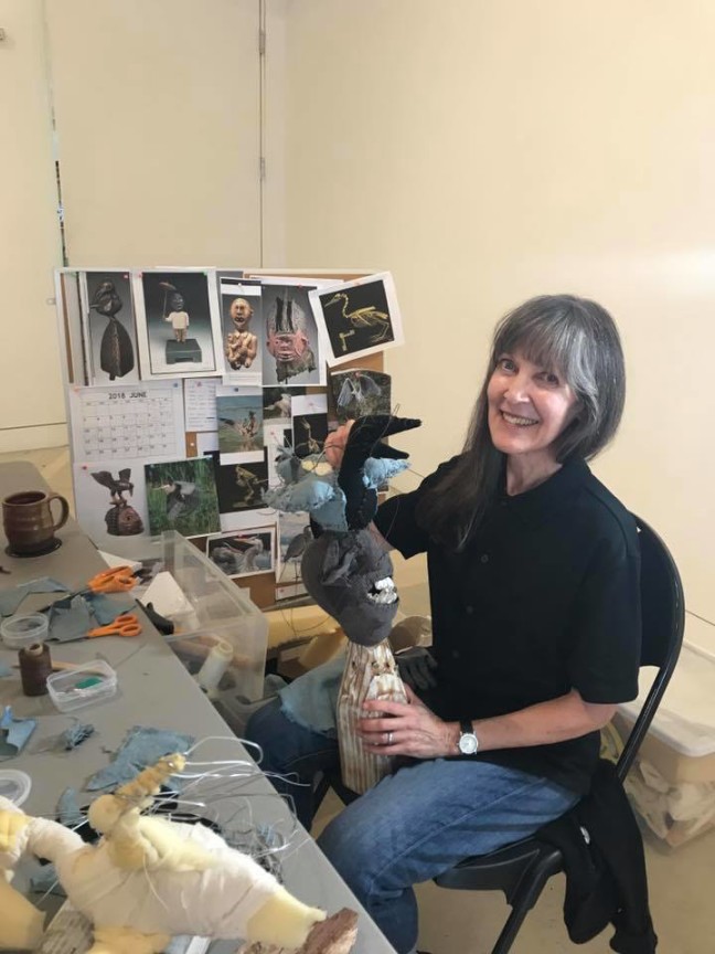 Samuelle Richardson builds sculptures from fabric and wood, creating beings that seem almost alive, and very much on the same page with the “woke” by love Skin Horse character. Her distinct, shabby-chic works are ready to take flight here, in what she describes as a flock of “angry birds.”