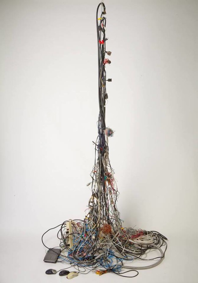With much of her material recycled from electronic and computer components, her ability to take technological detritus and reshape it creates works that are both haunting and alive, as if instead of conducting electrical current they are conducting the energy of art. Like her deeply dimensional sculptures, her 2D work is also focused on the linear, whether she is working with graphite, acrylic, oil, ink, or patterns created with the staples as a kind of embroidery.