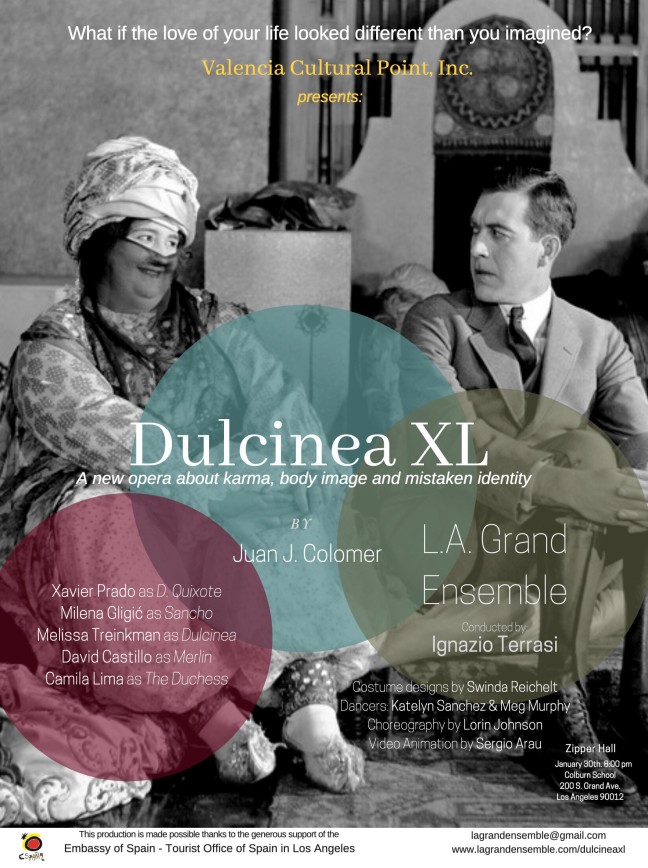 Dulcinea XL performed at the Colburn School in DTLA this week, is based on episodes of Don Quixote, according to Colomer. “It is based on the one in which Sancho, in order to cover his own lie, tries to make Quixote believe that an ugly and overweight peasant is the beautiful Dulcinea. Only this time, Quixote sees the reality, and thinks that he might be under a spell and that’s he can’t see her beauty. In the second act, a couple of Noblemen try to have fun at their expense, which includes Sancho having to pay for his lies.”