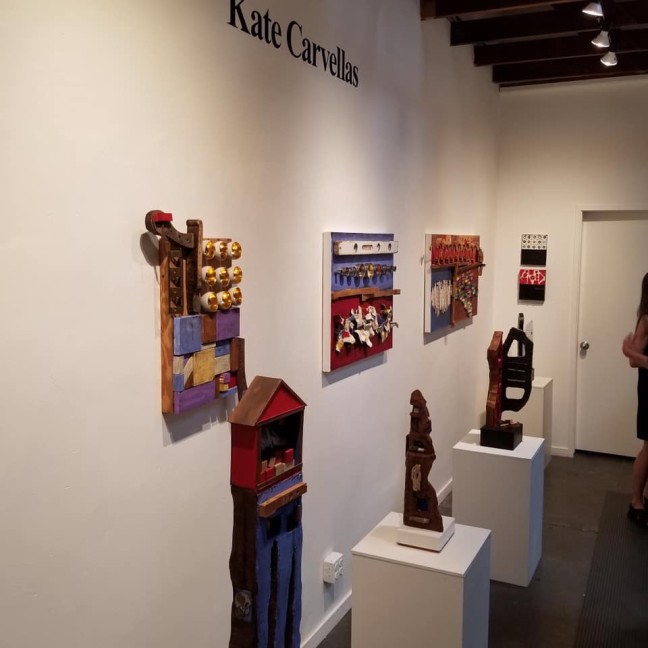 Working in a wide range of sculptures and mixed media wall art, artist Kate Carvellas uses found objects to create art that hums with energy, color, and fun. It’s both poetic and edgily whimsical, it tells stories that resonate and sing with substance, history, and the simple joy of creating “something” significant from “nothing” much.