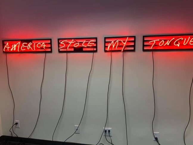 Antunes’ mixed media works are, as always, fascinating puzzle pieces, whether she is using acrylic and ink on canvas or faux leather with acrylic to shape a more dimensional work of wall art. There is poetry on handmade paper, held together with safety pins, thread, dye, and ink, and works that utilize cotton and thread, natural dye, and seeds.