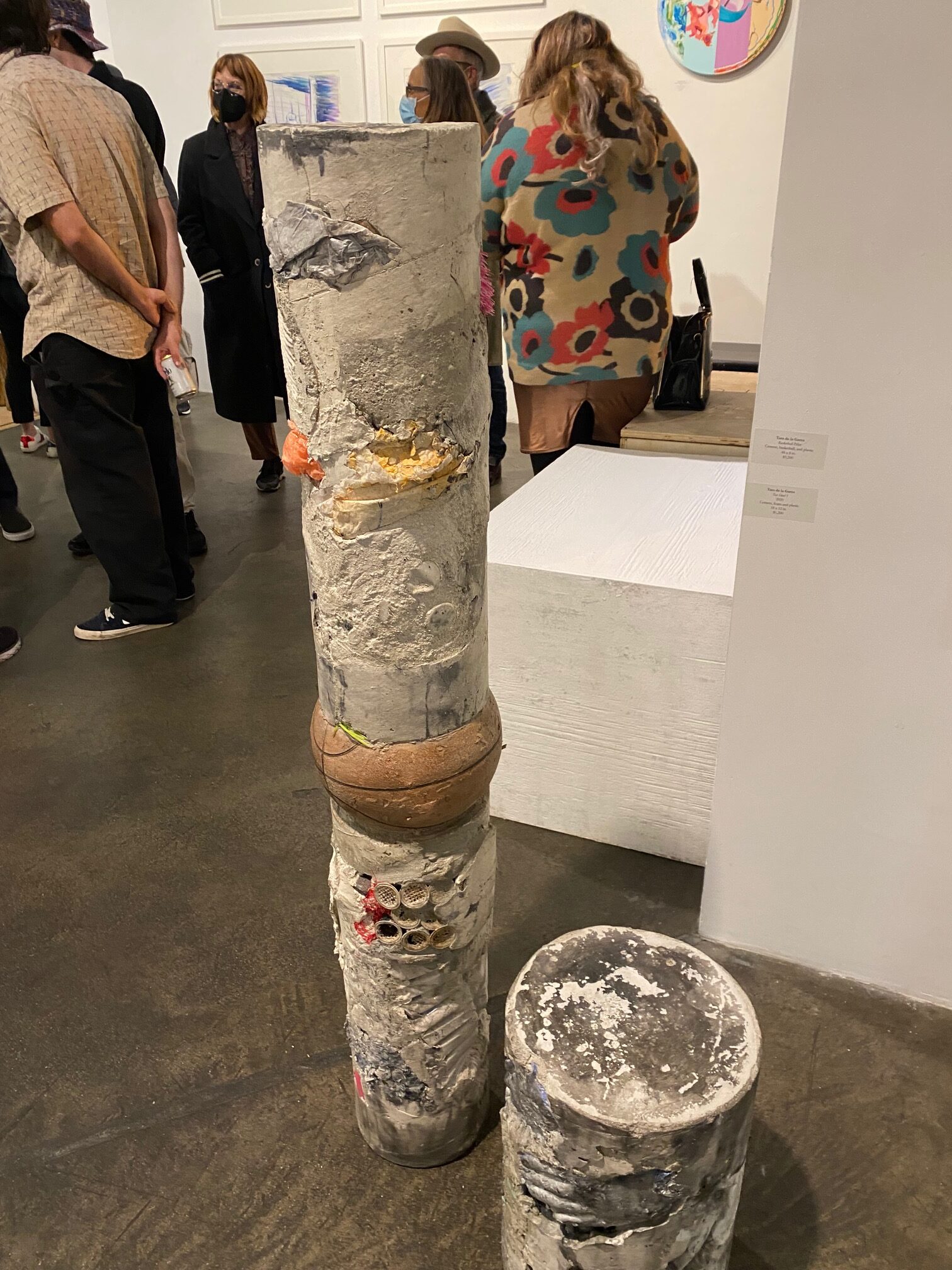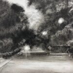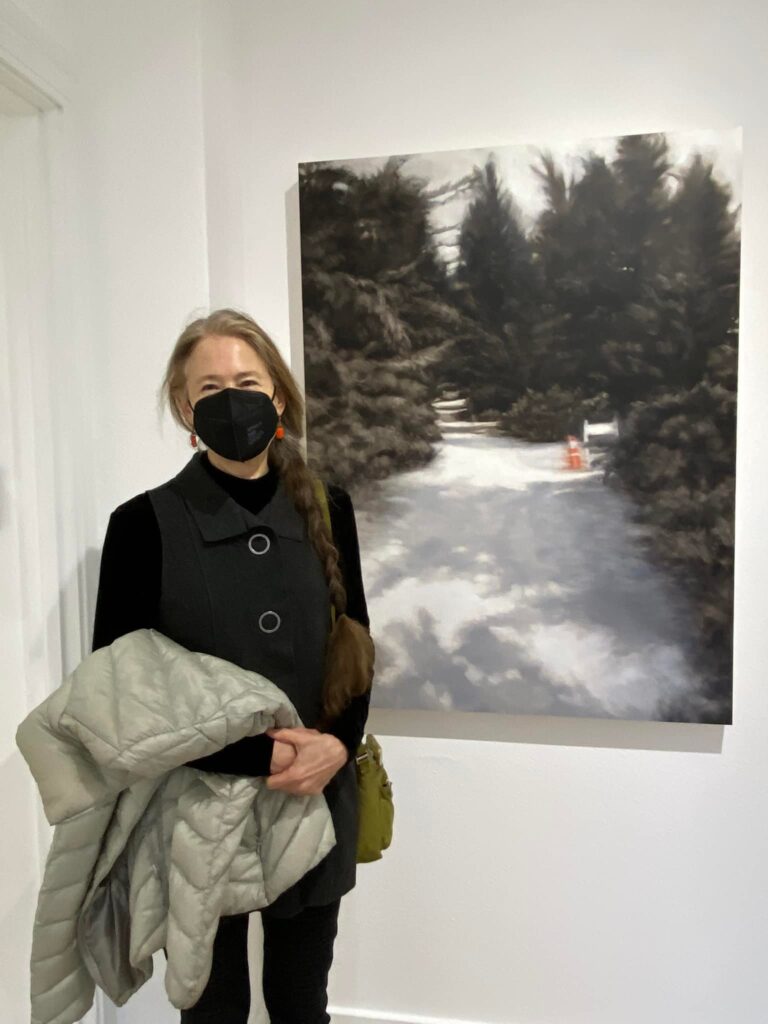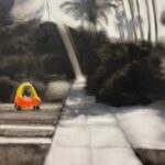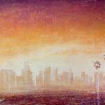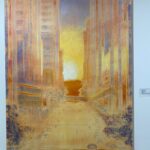 As she explores environmental issues and man’s fraught relationship with nature, her beautiful, shadowy landscapes haunt both with quiet beauty and the awareness that something just might be amiss. Like Rick, McDaniel also focuses primarily on the Los Angeles area, here depicting primarily the neighborhood sidewalks, streets, and trails around her home in the LA foothills near Pasadena. Elevating the ordinary elements of life to something extraordinary or worthy of deeper consideration, McDaniel gives us a brilliant orange and yellow tot’s pedal car, or a bright orange traffic cone positioned in the middle of a hauntingly curved dirt road lined with lush dark monochrome conifers. An intimate series of smaller, square works include a faint orange/gold shadow of light, as if appearing hazily from a sky grey with wildfire smoke; overhung with trees and shrubs, one bush takes on a reddish cast. As if emerging from a noir dream, the cityscapes McDaniel depicts are in palette, approach, and texture quite different indeed from Rick’s, but equally driven by the Los Angeles they love, and its light and shadow.