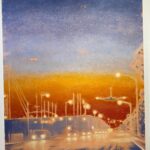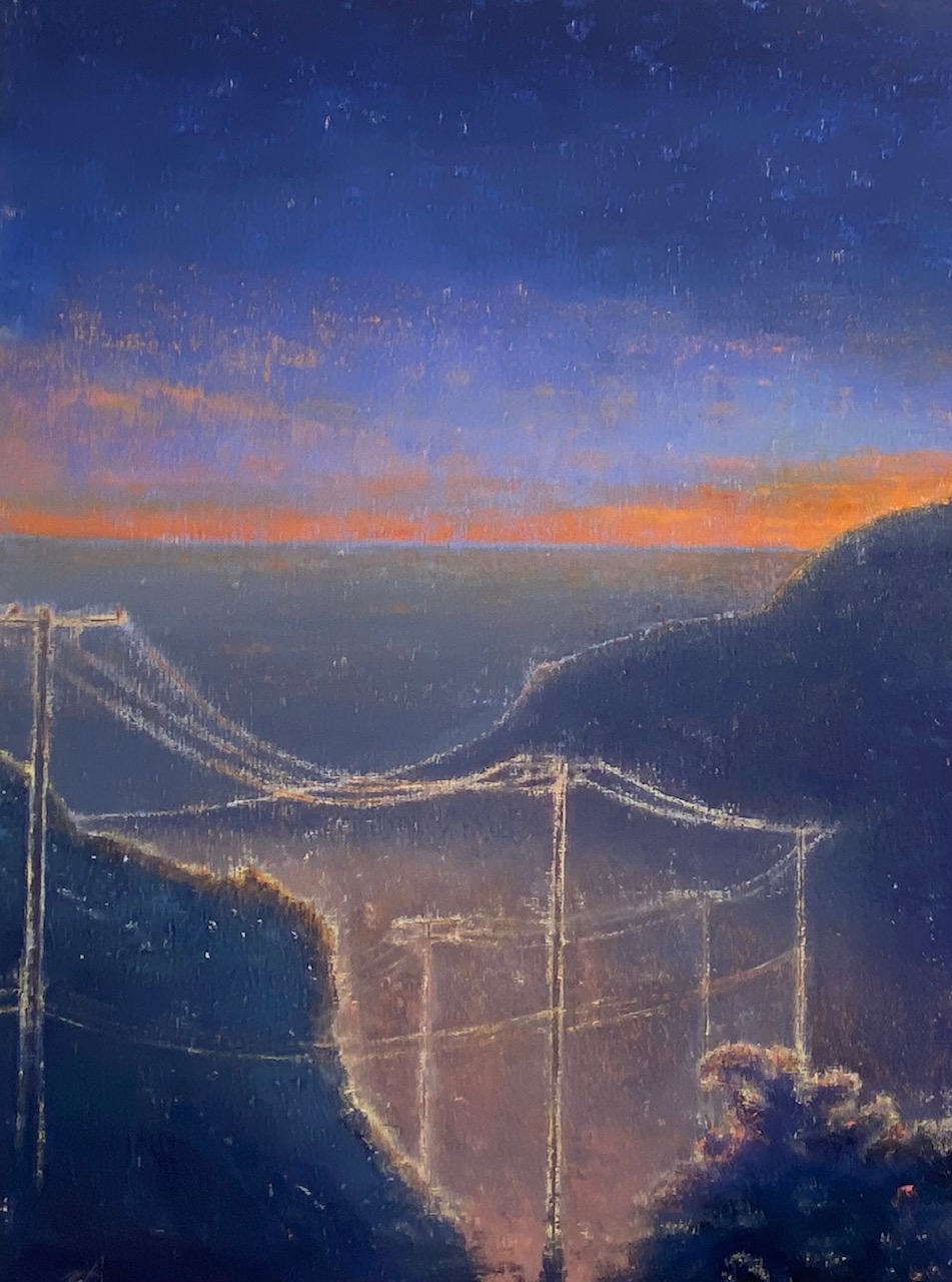 Her careful, poetic use of color gives us light along the sea and in the city, in mist or wildfire smoke, on a crystalline morning and in the stillness of dusk. Her paintings take us into a full spectrum of sunlight. The urban landscape of downtown Los Angeles provides the setting for a reverential sunrise gilding the summer streets of downtown in “City of Angels.” Heading west to the airport, “Into White” revels in a haunting wash of pale blue and white, as a plane lands in deep fog. The airport is again the setting for “Stand By,” as a rich pink sunset welcomes travelers to the LAX runways. While her work feels in so many ways influenced by and a love letter to Los Angeles light, Rick also depicts New York City in this exhibition. The twice-annual occurrence of “Phenomenon,” in which the sun sets precisely between iconic skyscrapers, takes on an almost supernaturally transportive loveliness in Rick’s skilled hands.