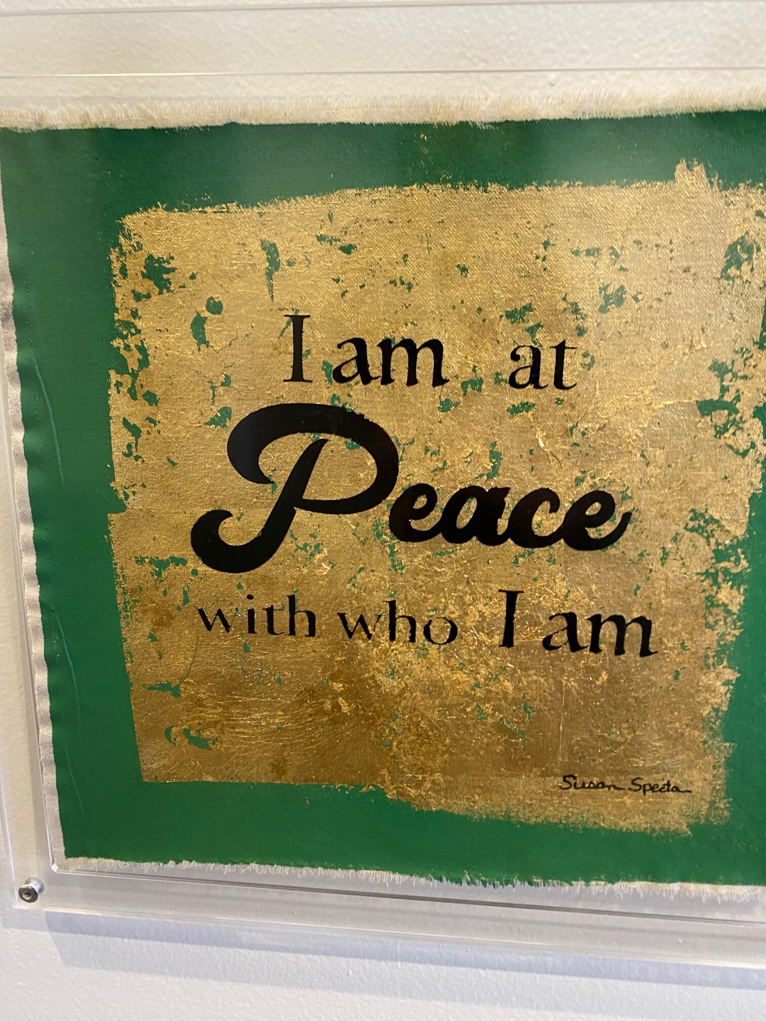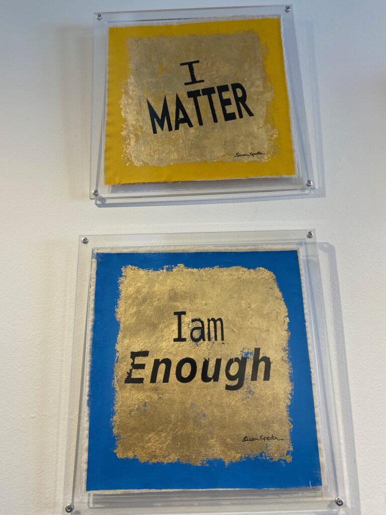Simple, heartfelt phrases such as “I matter,” “I am Enough,” and “I am at peace with who I am,” are presented on a solid colored background. The black type of the words, created in a variety of different type-faces including a cursive flourish on some words, is presented on a layer of gold leaf overlaid on the solid colored background. The viewer’s impression is that these words are especially valuable, and should be taken to heart.