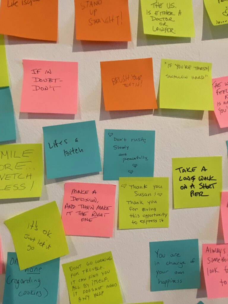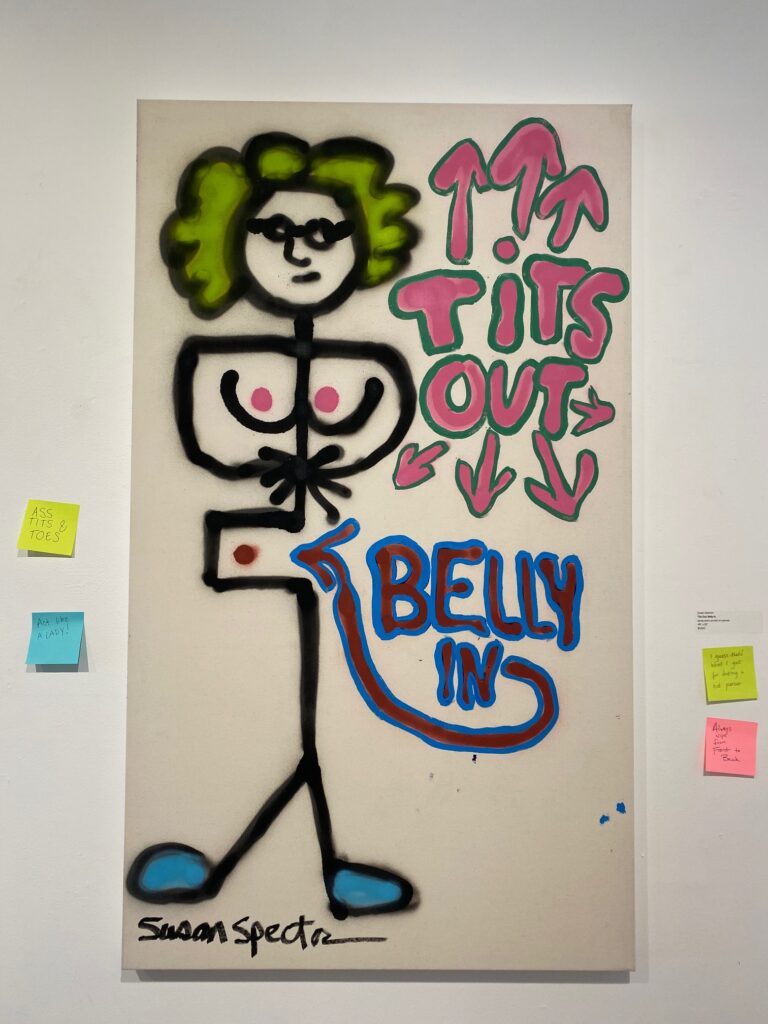Additionally fascinating were the Post-It’s added by viewers on the wall next to Spector’s work at TAG. There was “Why can’t you be more like your cousin,” next to the excellent advice “Don’t wait for everything to be okay to be happy.”  “Life is a bitch, “Brush your teeth,” and “Nobody’s Perfect” nestled close to “Take a long walk on a short pier.”