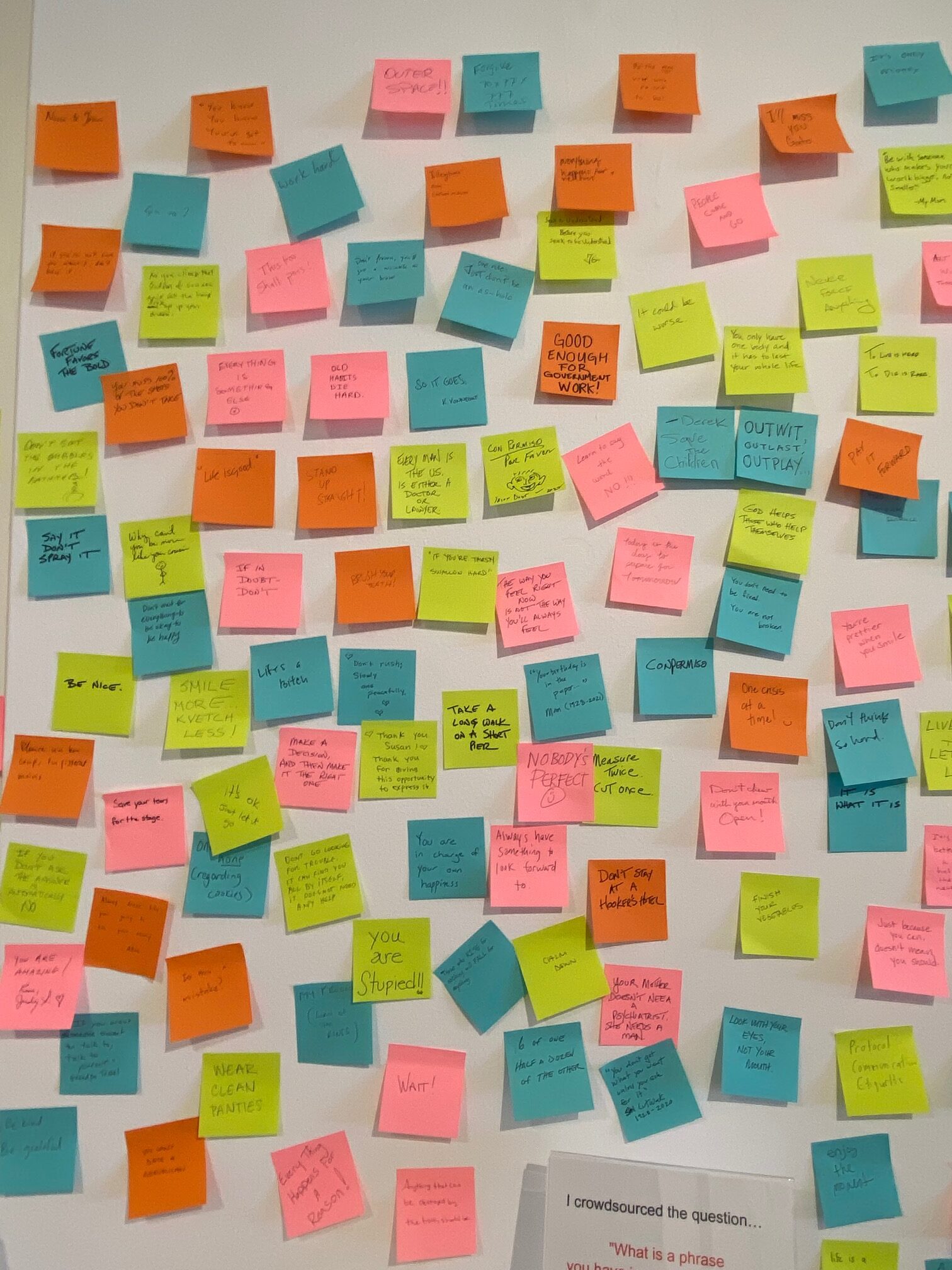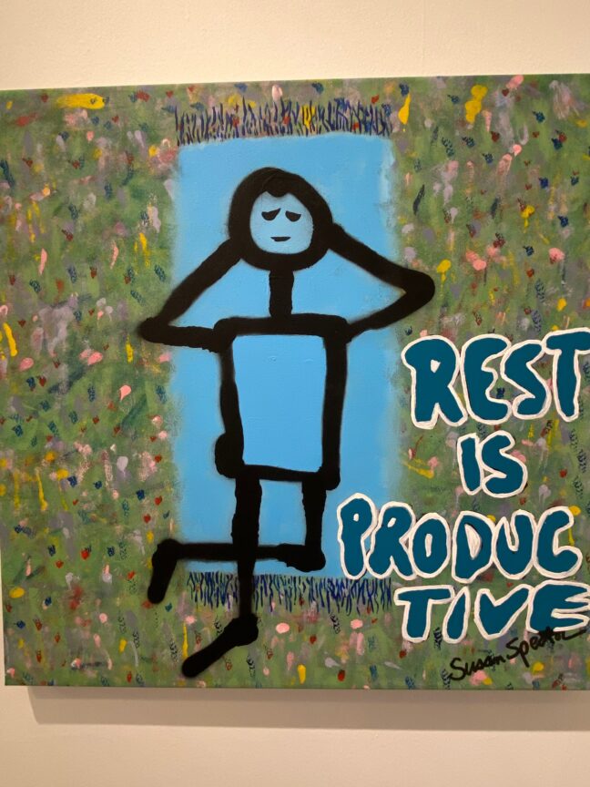 Simple painted figures are featured with phrases that are inspired by a question she asked during the COVID pandemic lockdown. That question being “What is a phrase from your past that has stayed with you forever?” She was still soliciting responses on Post-It Notes at the gallery – which we can hope leads to a part two for this smart work.