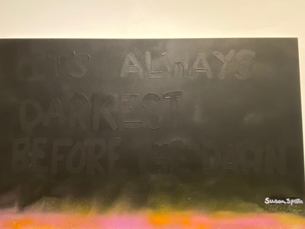 One of the most visually beautiful works is a primarily black on black work. Written against a dense black sky, the words “It’s always darkest before the dawn” are just discernable over a gorgeous rising line of pink, orange, and gold sunlight.
