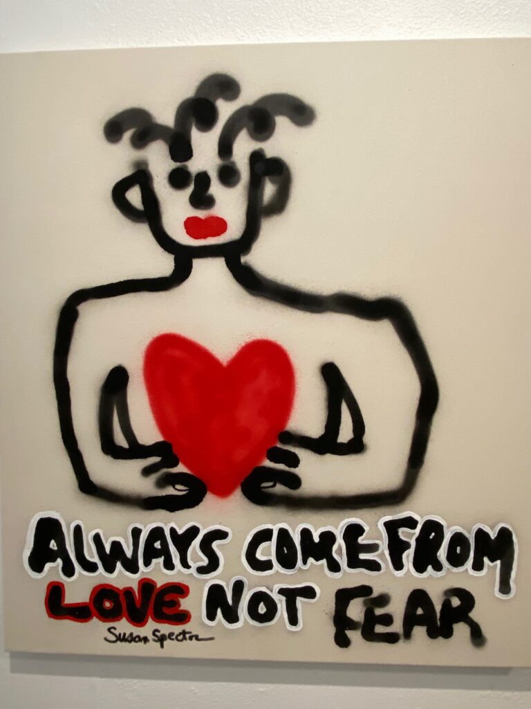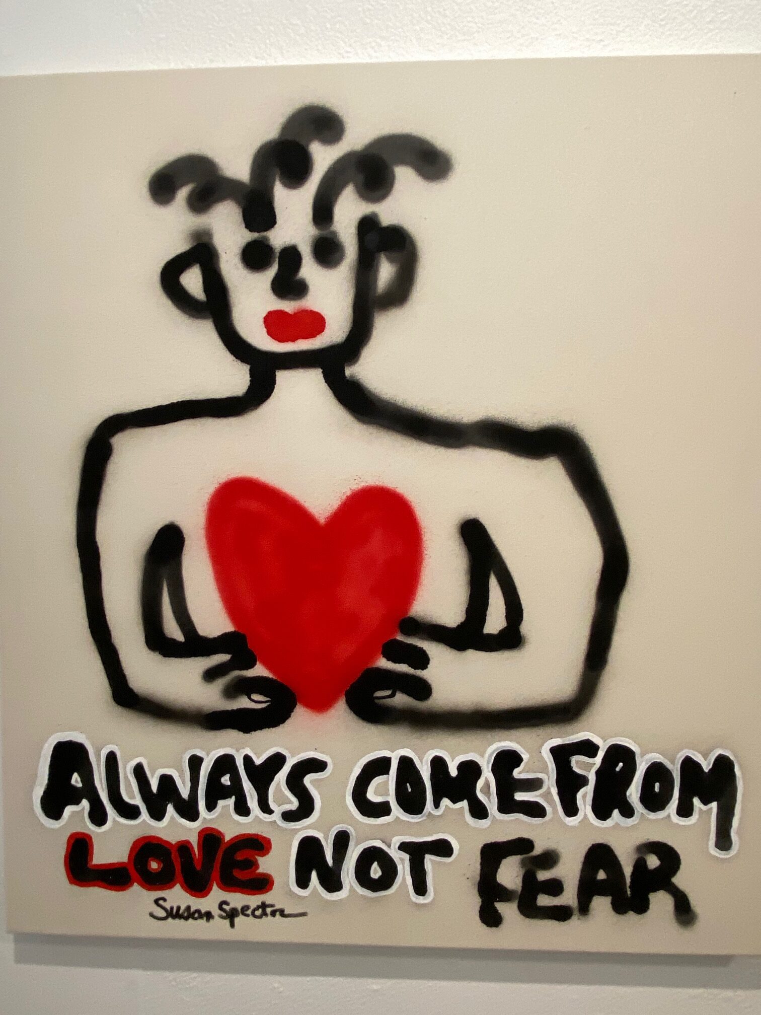 Other phrases are accompanied by her unique, yet simple illustrations – a curly haired individual, holding a red heart against an outlined chest features text at the bottom of the image that reads “Always come from love not fear.” While most of the words are in black type outlined in white, the word “love” is outlined in red to match that heart; the word “fear” is simply written in black.