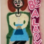 Nearby, a blue-skirted, wide-eyed figure perches demurely on a chair while pink letters spell out “Be A Lady” in a long line beside her,  an invisible, internalized authoritarian instructing her behavior.