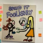 “Spend it foolishly” looks as delightful as the advice written in thick silver letters. Here, a bent-figured grandma reaches to hand two eager children dollar bills stacked in both her hands.