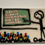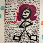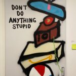 Precariously balanced items plugged into a wall socket are the accompaniment to “Don’t Do Anything Stupid,” written simply in black.  In another work, a large figure points to a screen which smaller audience-member figures look up to view.  On the screen are written “3 Rules: Show Up, Speak Your Truth, Don’t Die Wondering.” Meanwhile, an aggreived looking stick figure is accompanied by a text bubble reading “Before you decide you’re depressed, make sure you’re not surrounded by a bunch of assholes.” And indeed, in close proximity all around her are what appear to be small outlines of just that – literal assholes.