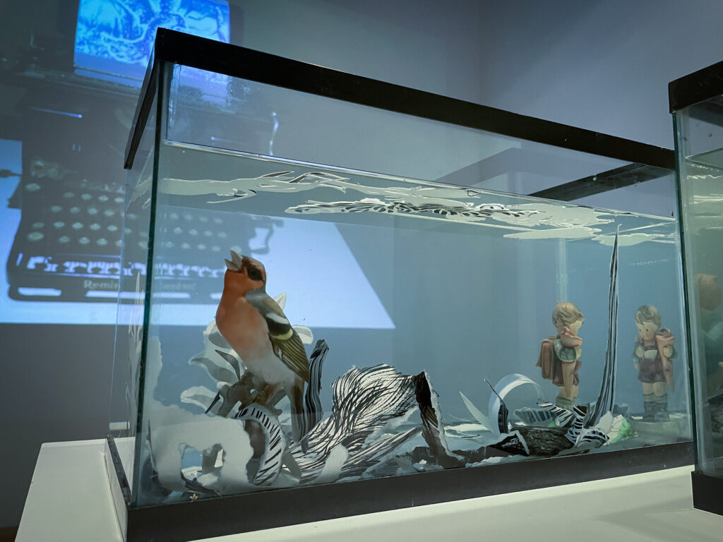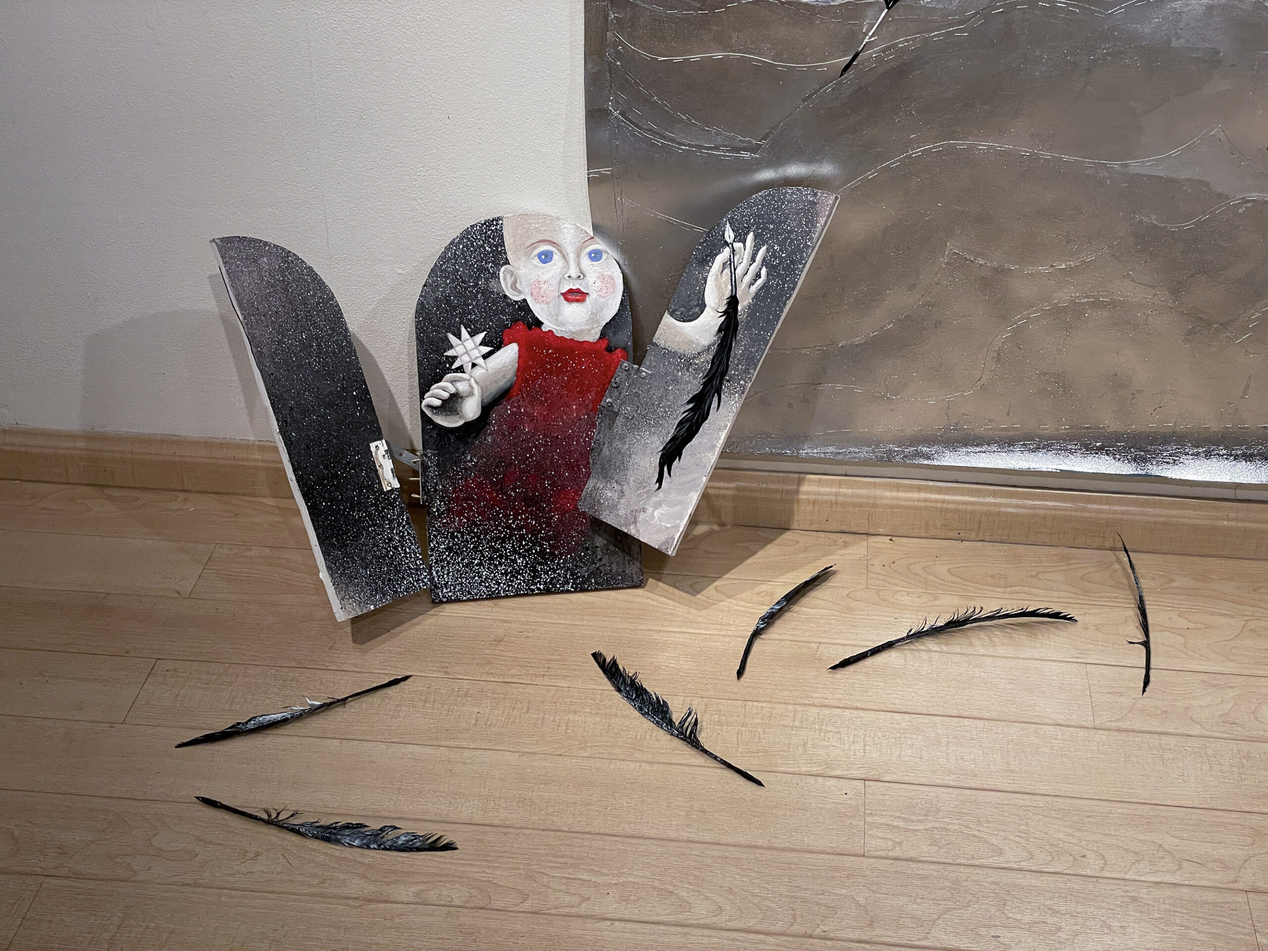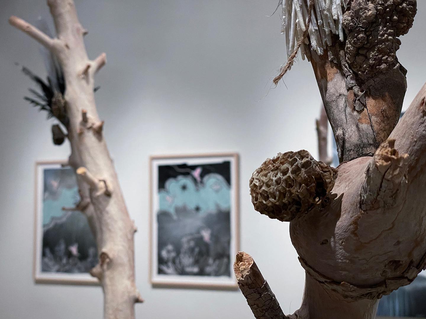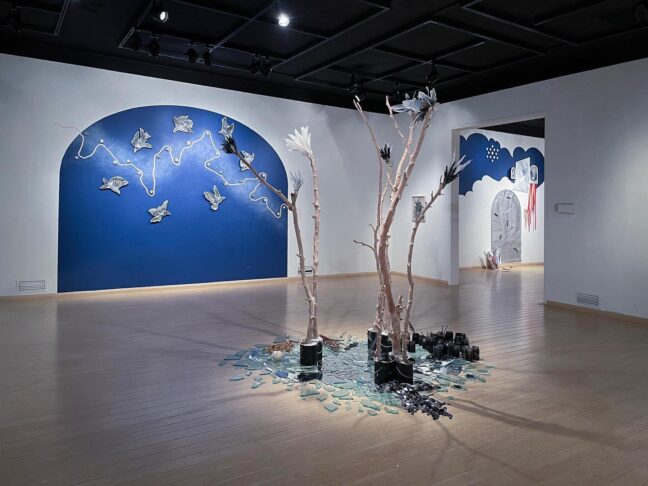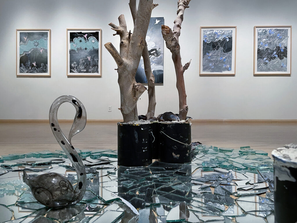 In “Wasteland,” a free-standing mixed media installation encompassing paint and ink, barren trees, paint cans, cement, broken glass, broken mirror, paper, and a collection of found wire, feathers, glass jars, and shells, as well as miscellaneous thrift store finds, the viewer is presented with a conundrum. These are desolate objects contained in this installation, but nonetheless they’re beautiful, graceful, and moving to observe.