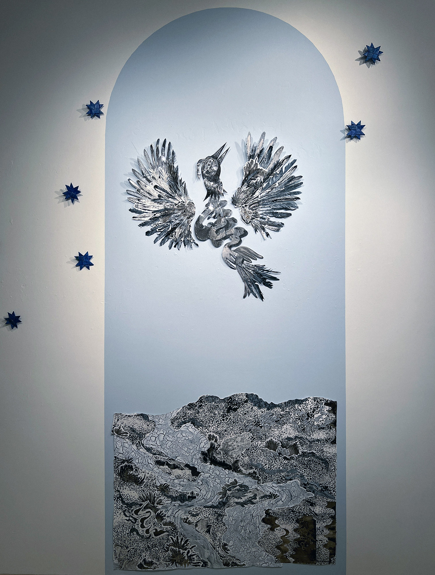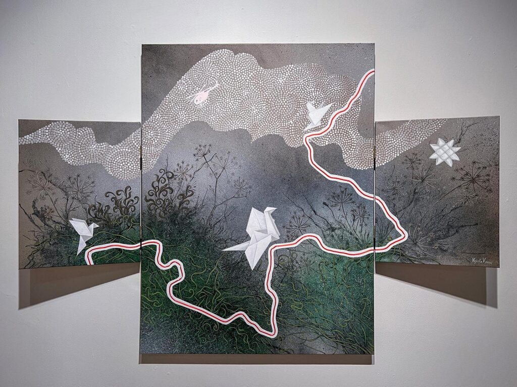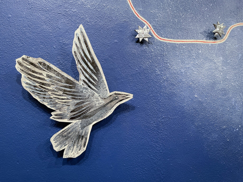Directly behind the mid-gallery “Wasteland, ” the fierce blue and lustrous silver of “Ancient Wanderers,” is also a mix of acrylic paint, silver leaf, and peaslescent push pins. The work also features beautiful paper stars created from old road maps, as if showing us the way through our struggle. These birds are leading us somewhere that the sky is still clear and the air is sweet, and the road ahead literally papered with stars.