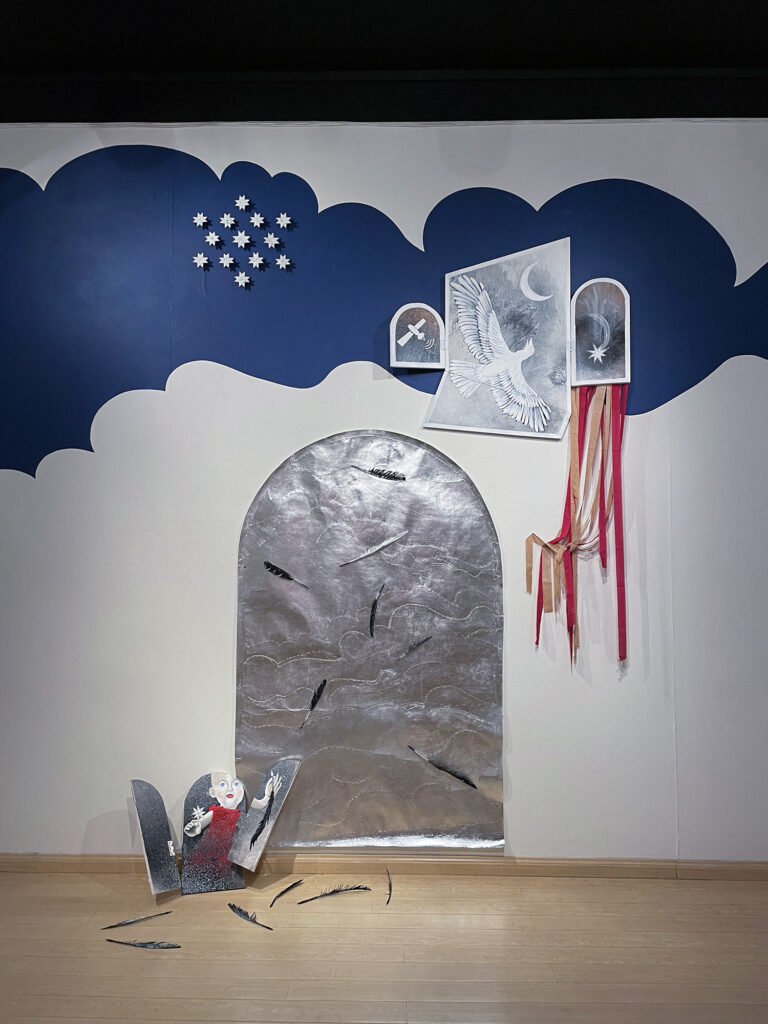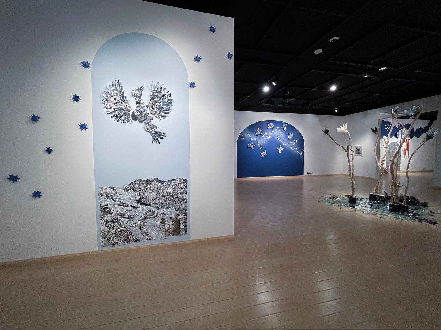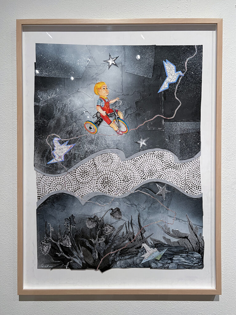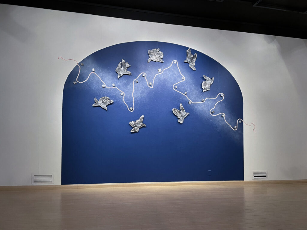 Directly behind the mid-gallery “Wasteland, ” the fierce blue and lustrous silver of “Ancient Wanderers,” is also a mix of acrylic paint, silver leaf, and peaslescent push pins. The work also features beautiful paper stars created from old road maps, as if showing us the way through our struggle. These birds are leading us somewhere that the sky is still clear and the air is sweet, and the road ahead literally papered with stars.