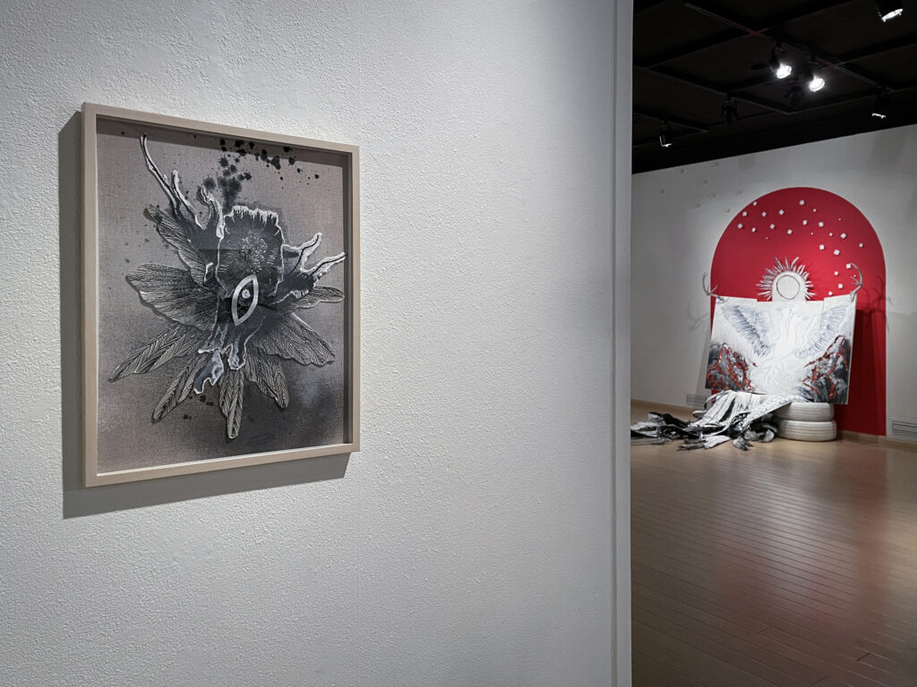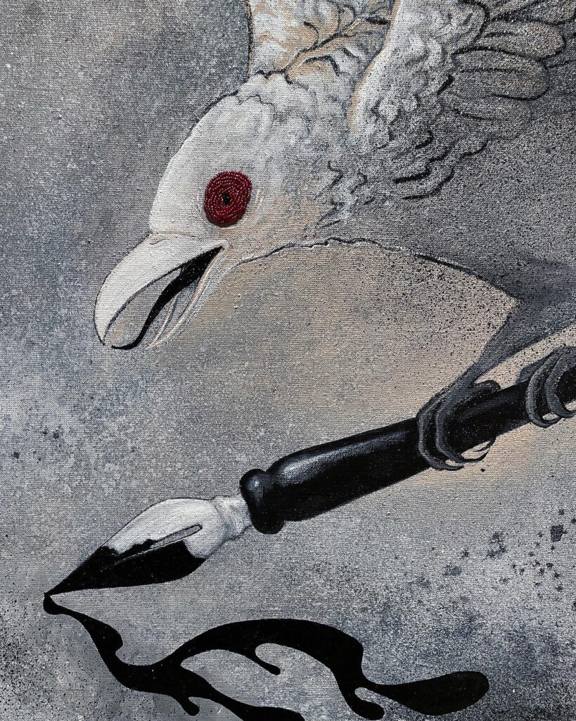 Curated in at an angle but still in juxtaposition, “Rising from the Ashes III” brings us the hope culled from our observation of that eloquent “Wasteland.” This is a flat out beautiful piece, combining acrylic paint with elements ranging form ink and feathers to silver thread and plastic beads, creating a rich tapestry both fanciful and alchemic. Wings spread wide, stars trailing across the wall like the discarded flowers of a celestial garden, there’s a struggle here, as well as an ultimate sense of rising victory.