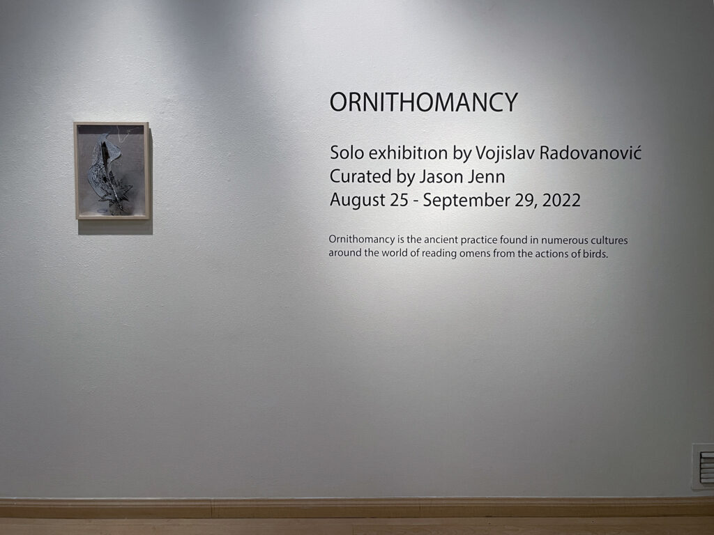 As always, infused with poetry, spirit, and magic, the works by Vojislav Radovanović in his new solo exhibition assuredly dazzle. Curated by Jason Jenn, Radovanovic’s ORNITHOMANCY, now at Diana Berger Gallery through the 29th, is a resonant and rather astonishing blend of despair and joy.