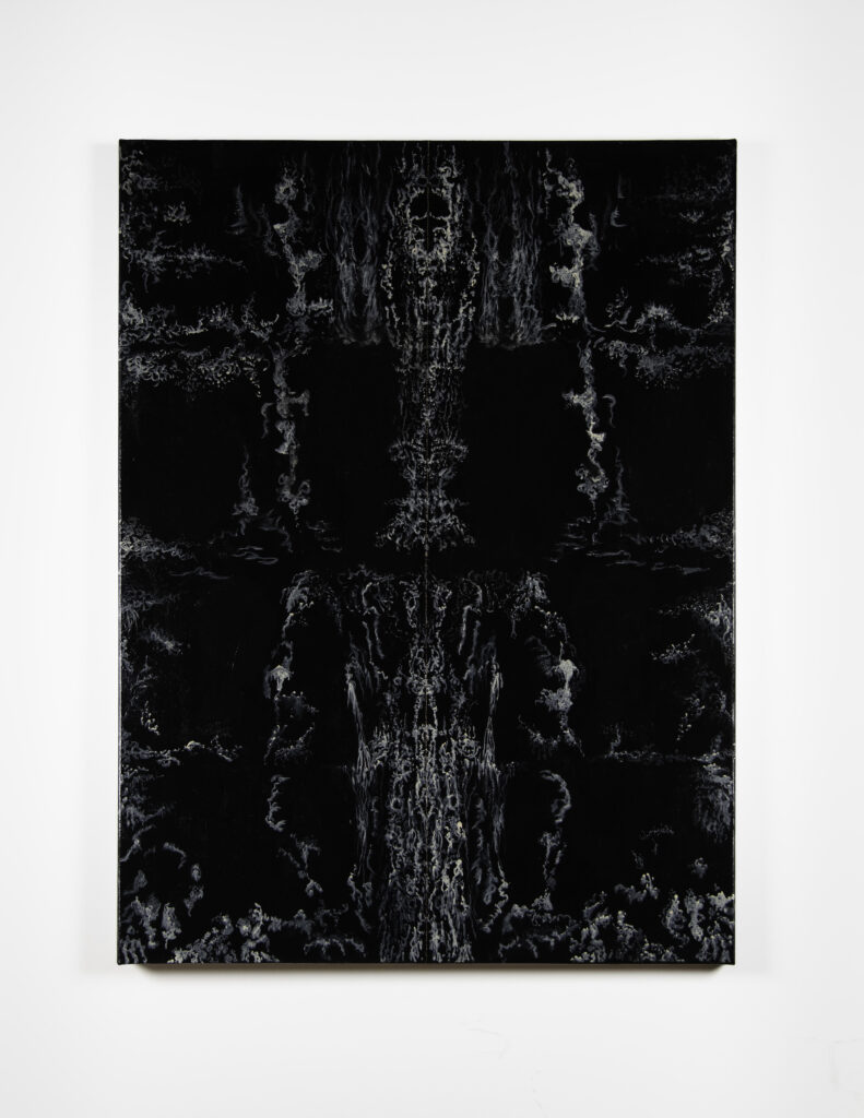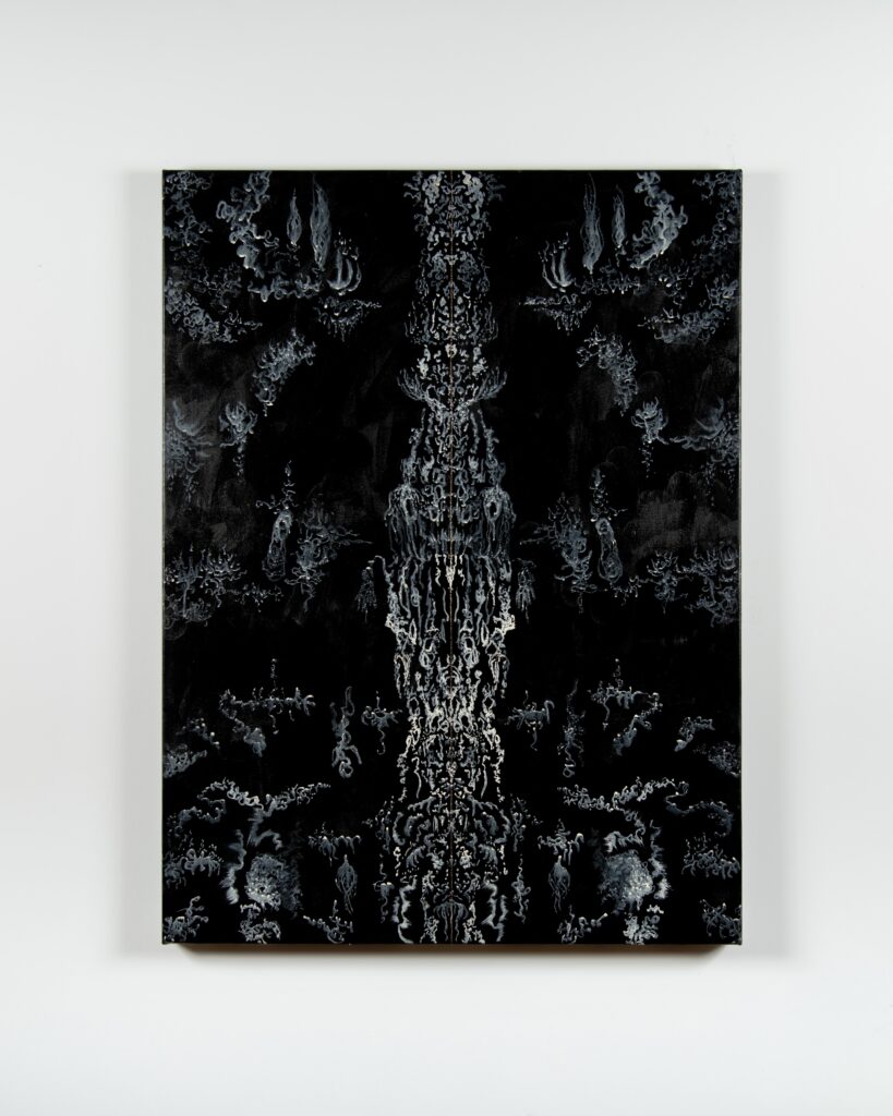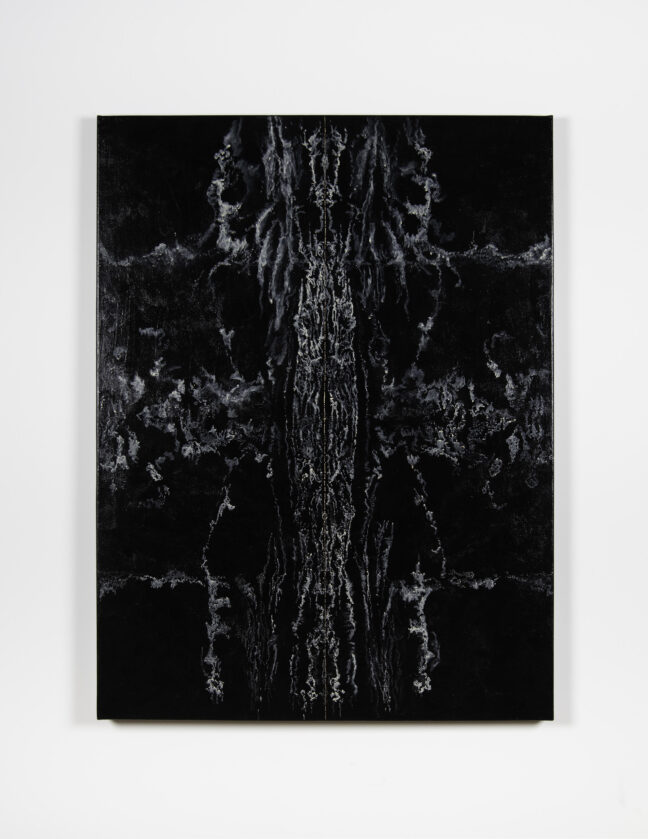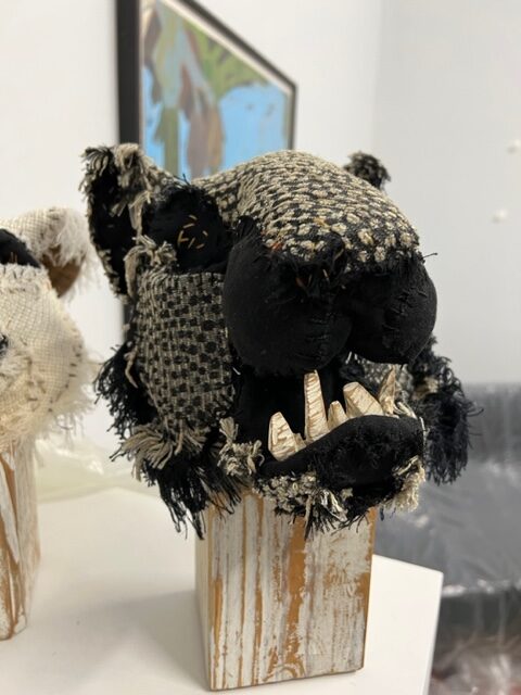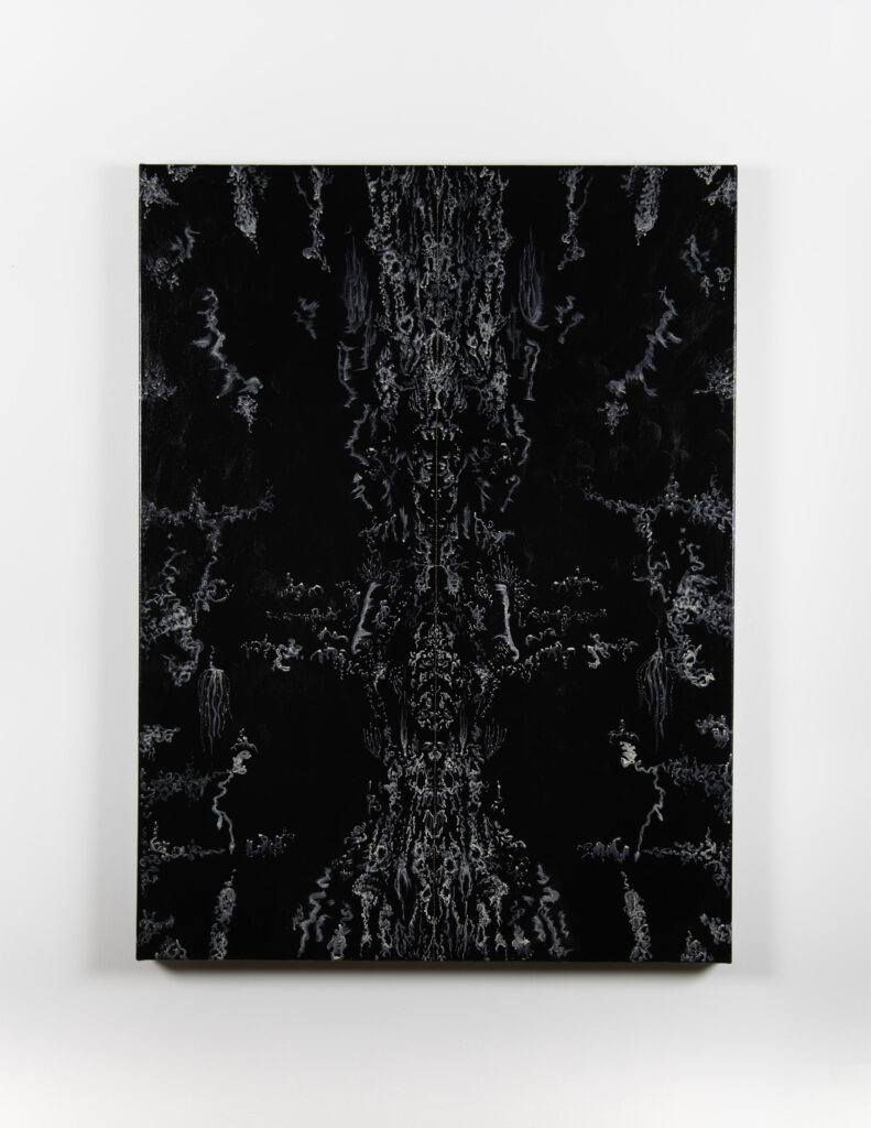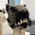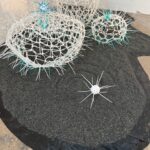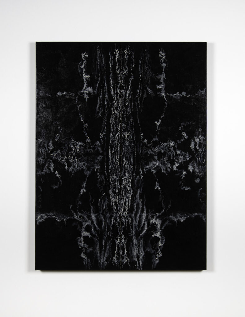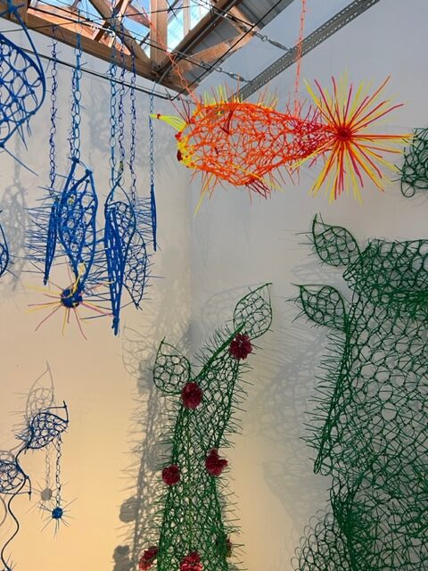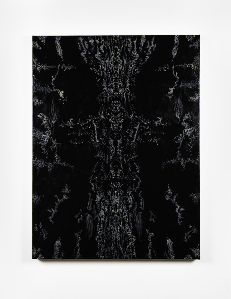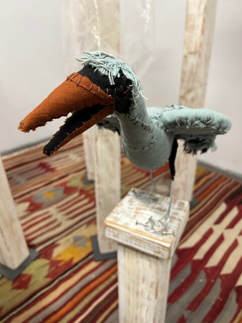 Before describing the wonders of this Playground, it’s more than worth noting that it is a big departure from the artist’s delicate, spiritual, almost ethereal work in a solo exhibition at Diana Berger Gallery, ORNITHOMANCY, with its almost-holy references to nature, the universe, and the spiritual. In that exhibition, color palette often focused on silver, blue, grey, black, and mirrored or liquid surfaces. But it, too, like this exhibition, featured a mixed media exploration of both human light and darkness.