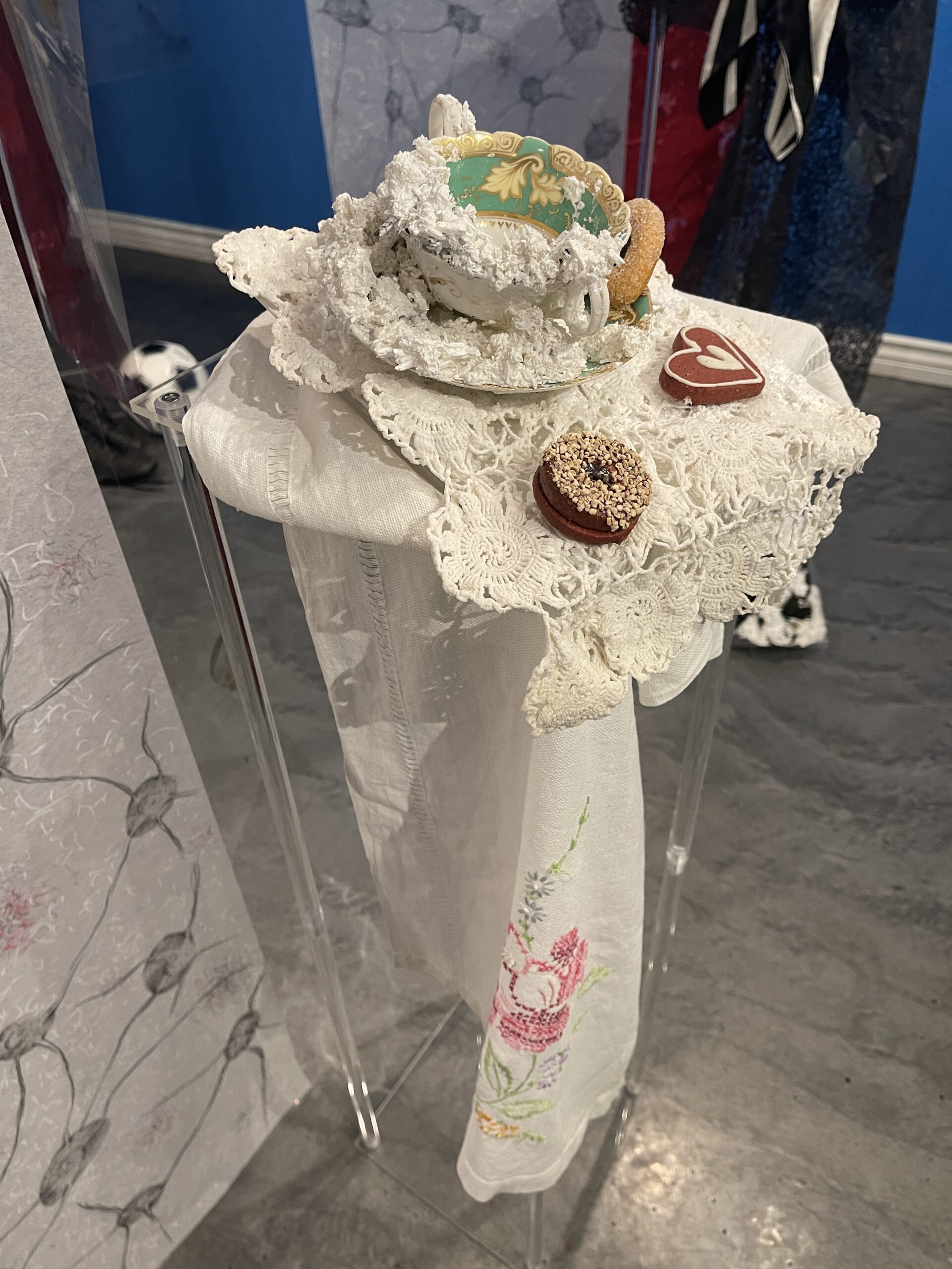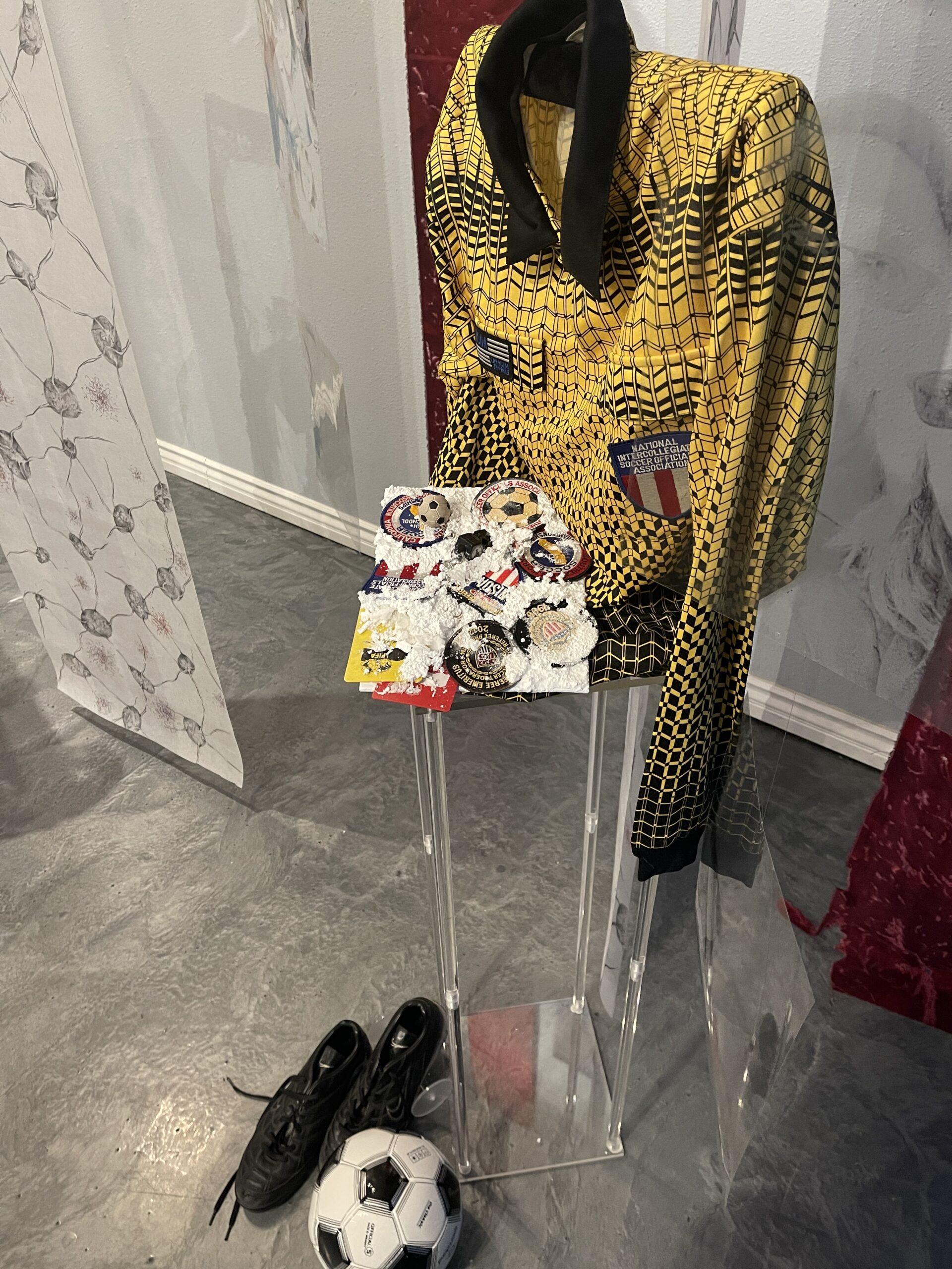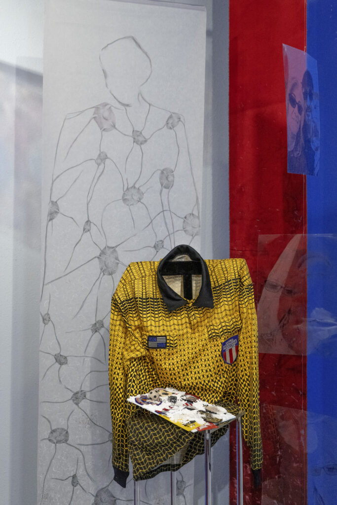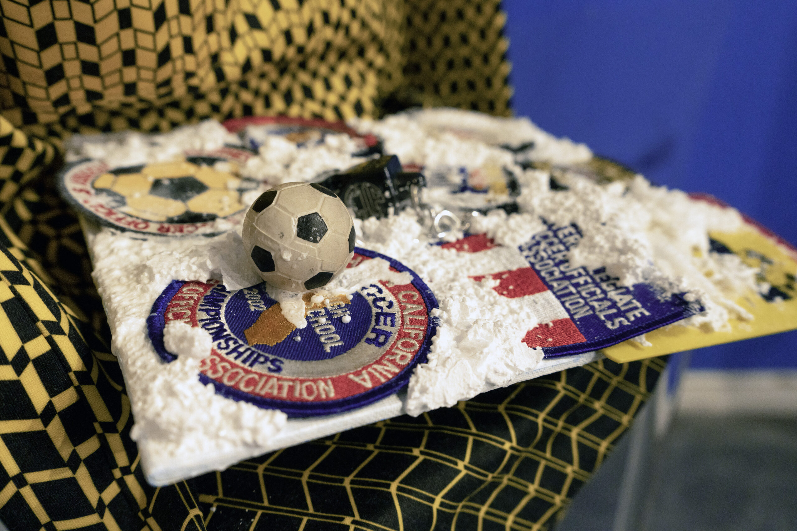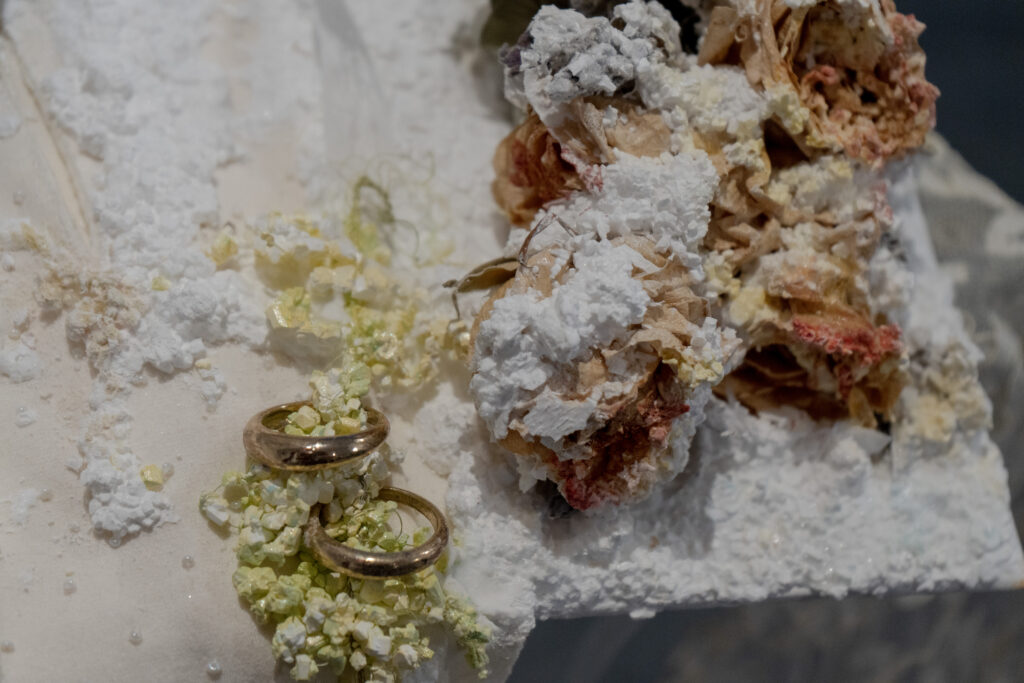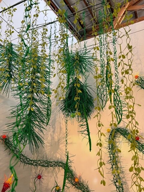 Before describing the wonders of this Playground, it’s more than worth noting that it is a big departure from the artist’s delicate, spiritual, almost ethereal work in a solo exhibition at Diana Berger Gallery, ORNITHOMANCY, with its almost-holy references to nature, the universe, and the spiritual. In that exhibition, color palette often focused on silver, blue, grey, black, and mirrored or liquid surfaces. But it, too, like this exhibition, featured a mixed media exploration of both human light and darkness.