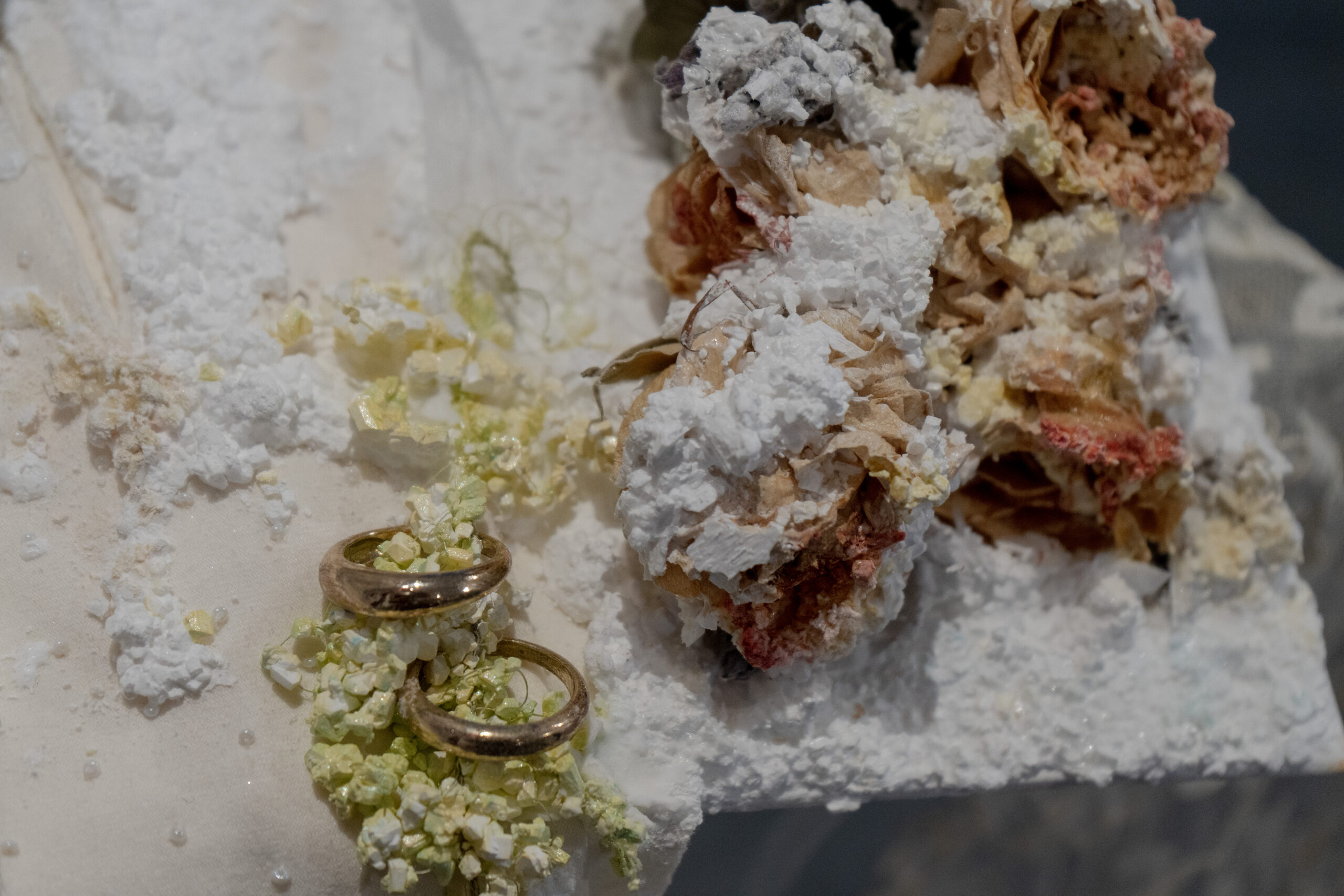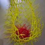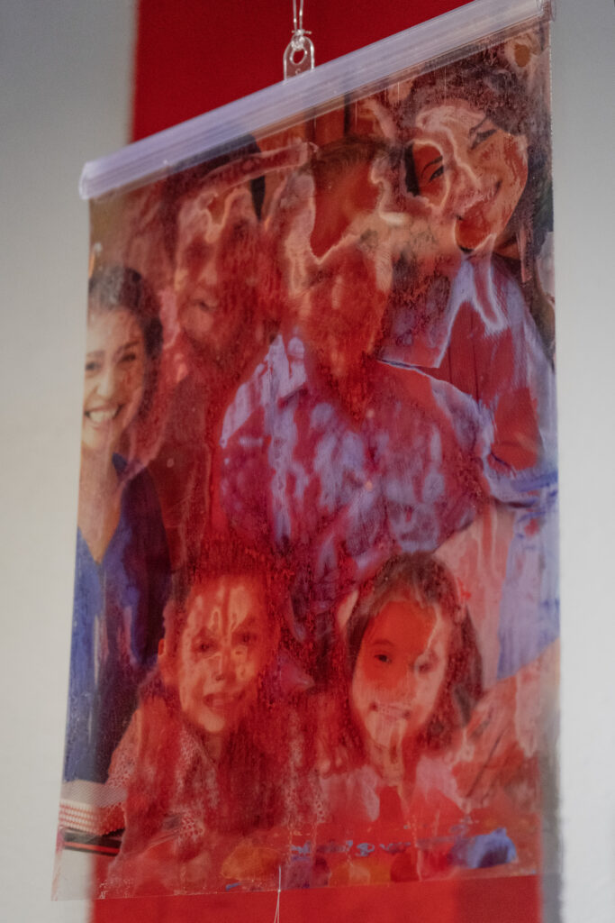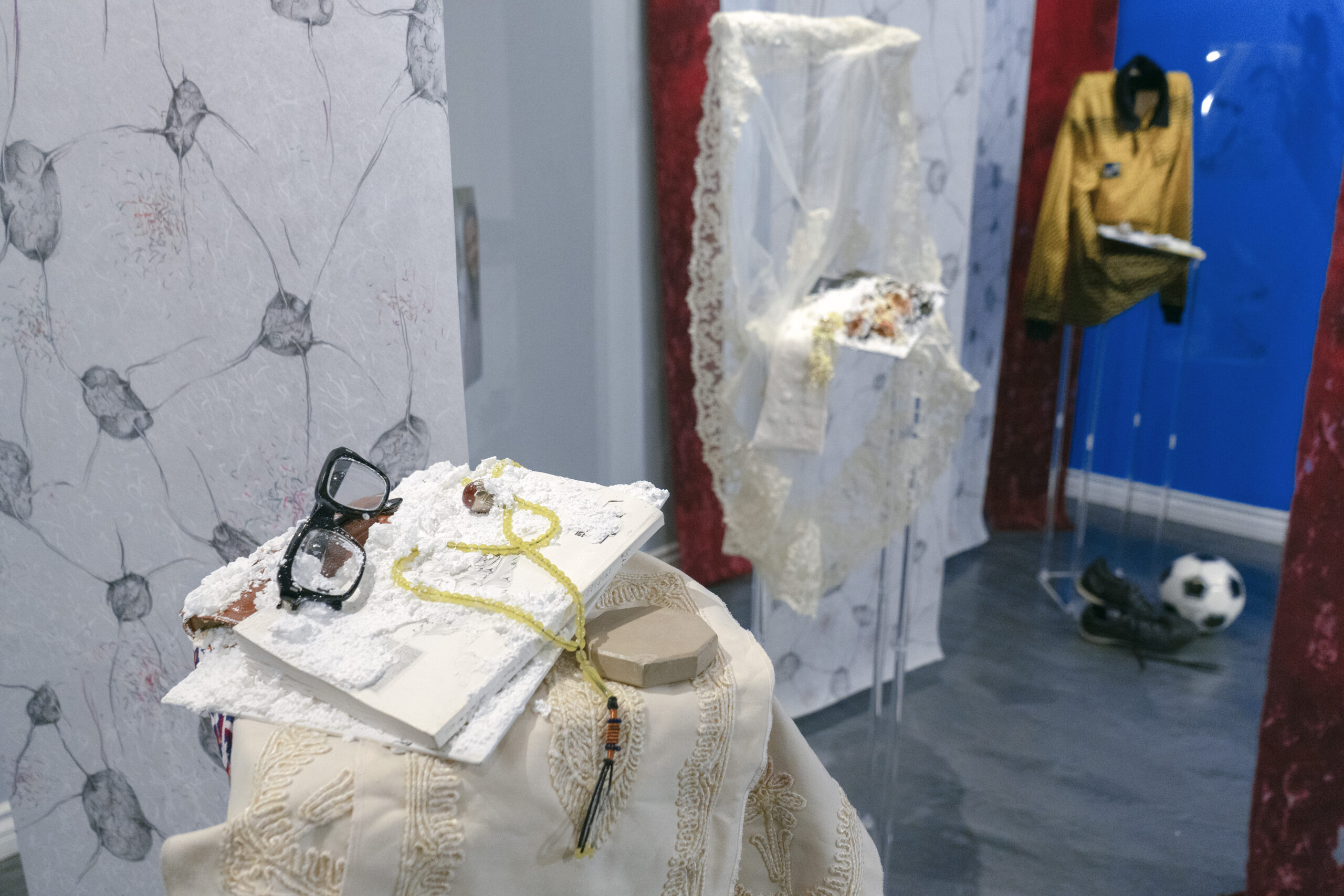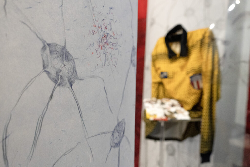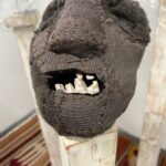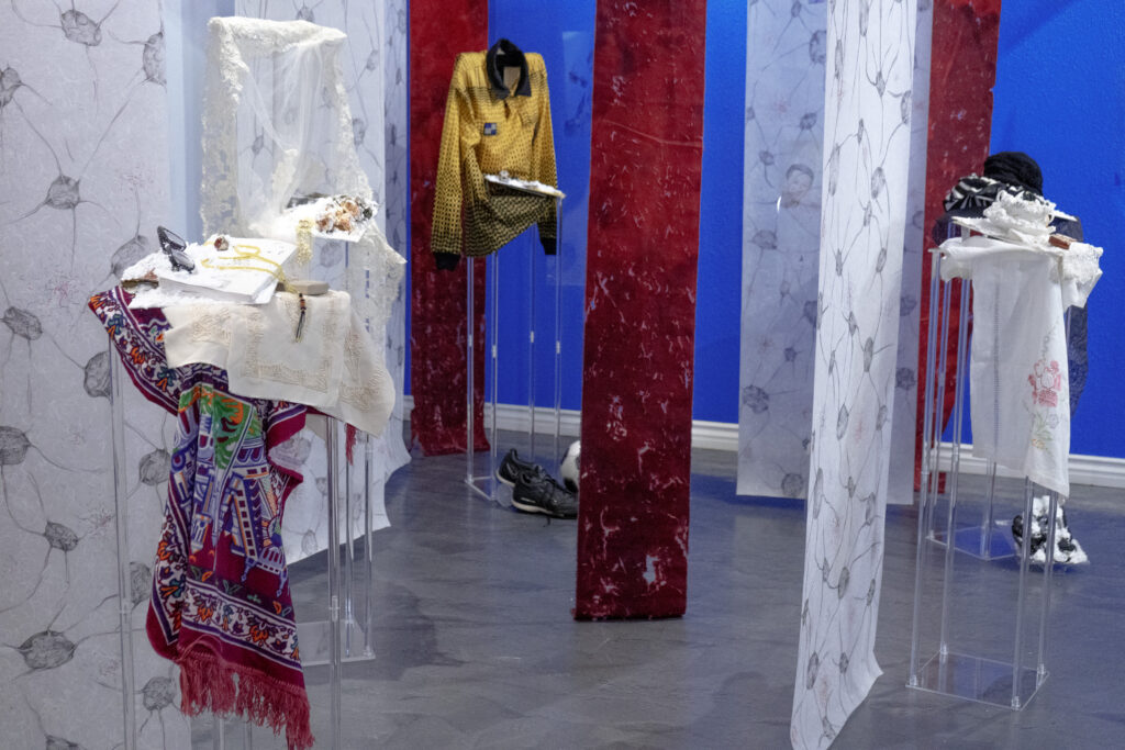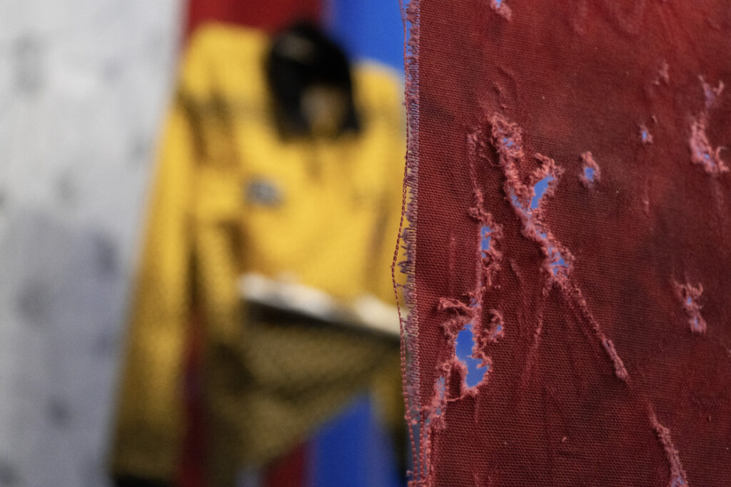 Before describing the wonders of this Playground, it’s more than worth noting that it is a big departure from the artist’s delicate, spiritual, almost ethereal work in a solo exhibition at Diana Berger Gallery, ORNITHOMANCY, with its almost-holy references to nature, the universe, and the spiritual. In that exhibition, color palette often focused on silver, blue, grey, black, and mirrored or liquid surfaces. But it, too, like this exhibition, featured a mixed media exploration of both human light and darkness.