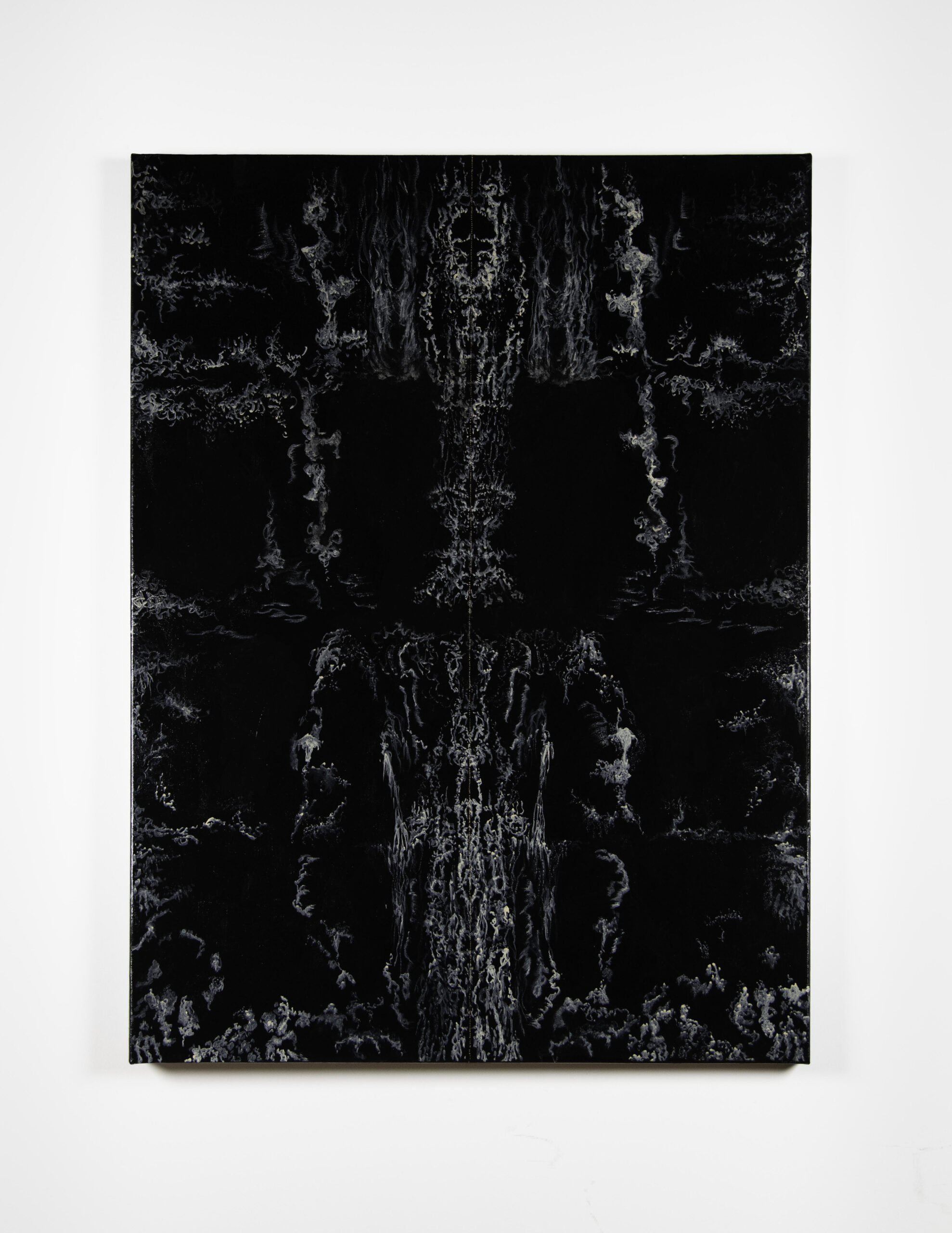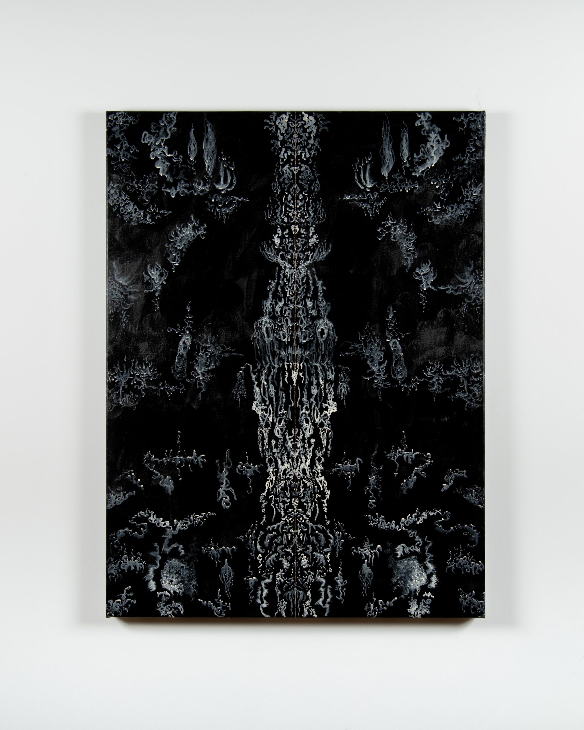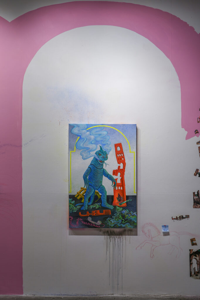 The main gallery also includes site-specific elements, such as the pink arches painted on the gallery’s white walls, reflecting the form of the abandonded gymnasium depicted in the video. The acrylic paintings themselves are fantasy personified, but grounded in themes of redemption, the kind that can only be achieved by reconciling losses and finding new meaning through them. It is a glorious vision, filled with both whimsical elements and darkness.