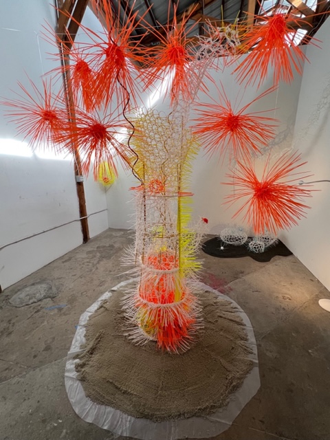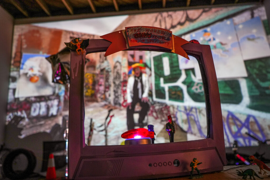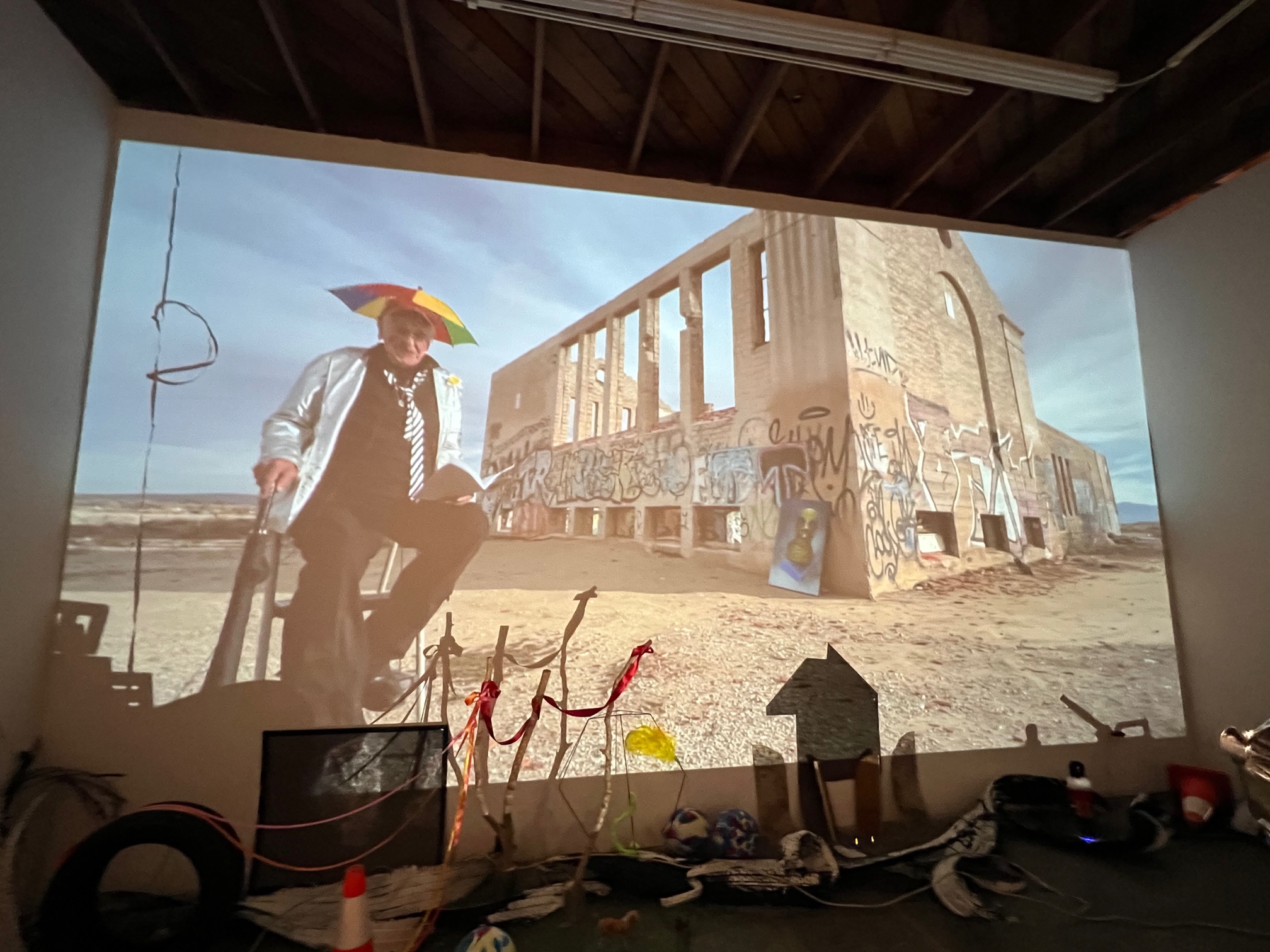 That specific setting is used in a site specific video projected in the back gallery, with scattered toys and discarded objects like computer parts and safety cones strewn on the floor in front of the projection. The viewer is invited to watch both the projection unfold and how its images look when viewed through or around these objects, adding a vibrant textural and sculptural element to the video.
