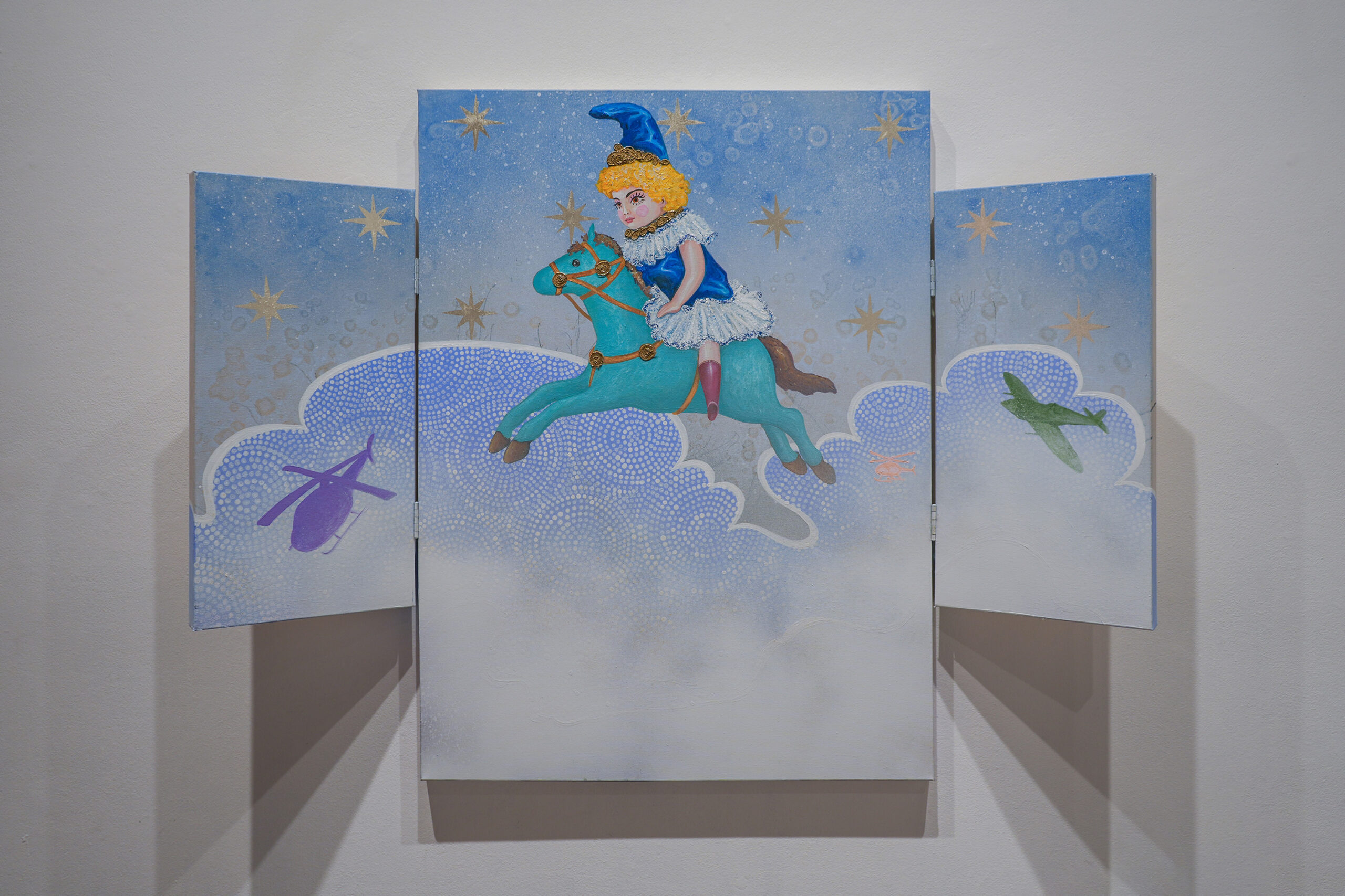 Some of my favorite works are perhaps the softest: in the large-scale triptych “Europa,” a blonde cherub in circus garb rides a blue rocking-horse-like pony through a sky filled with stars. She is the central figure in the triptych, the two sides of which feature silhouettes of a helicopter and an airplane, both toys and ominous fellow residents of the sky in which she rides.