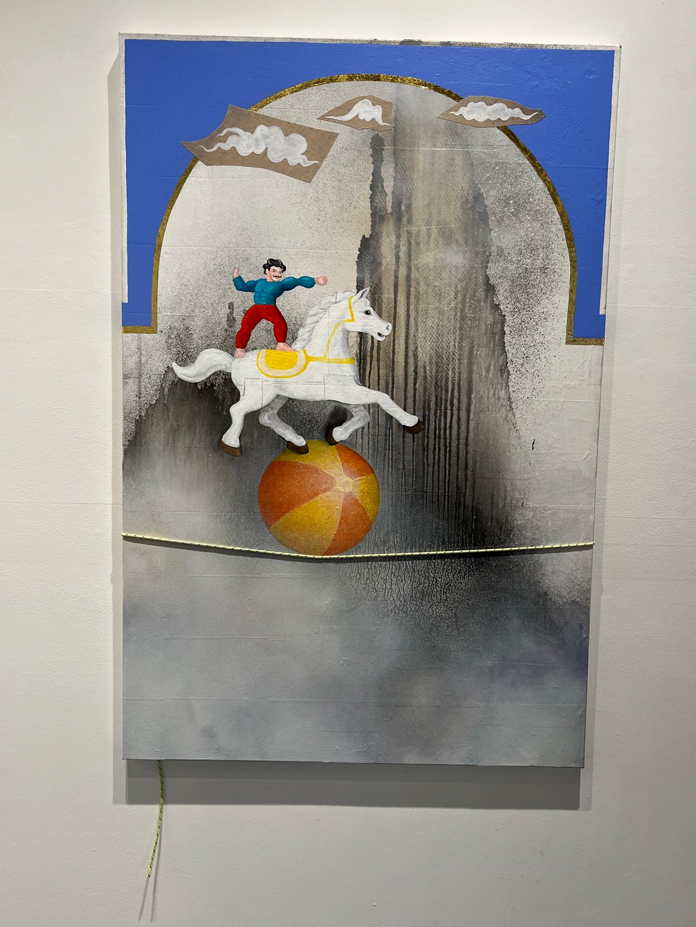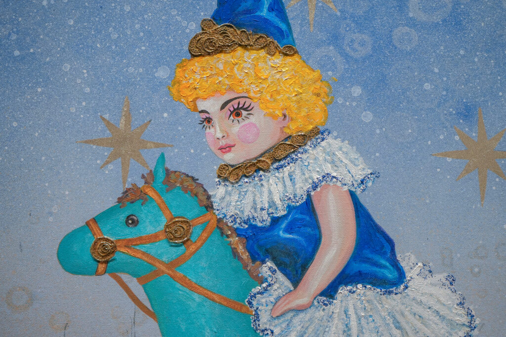“Everyday Balancing Act” gives us a muscular strong man riding a white horse balanced on a striped ball across a golden wire. Clouds rise in ghostly puffs around a foggy grey mountain backdrop. This may be a very brave man, playfully conquoring a desolate landscape, or it is simply the way we all live, day in and day out, on the precarious edge of getting by. “Star Wrangler” is just that – a lavendar-clad cowboy lassoing stars, gracious, happy, riding his horse with aplomb. Be the star wrangler.