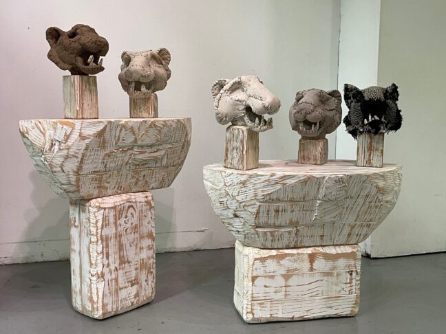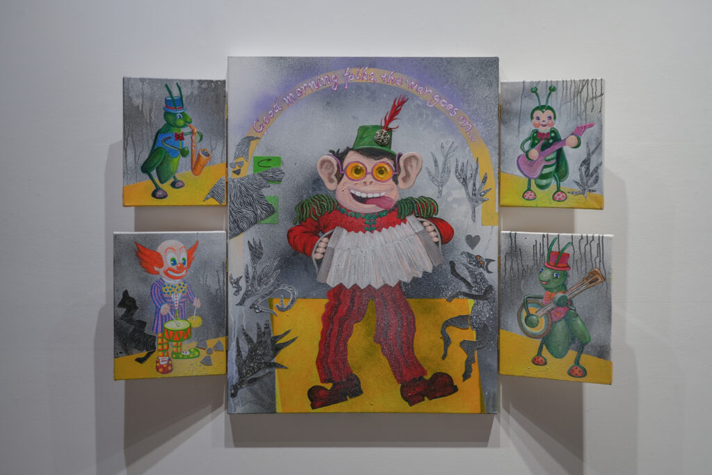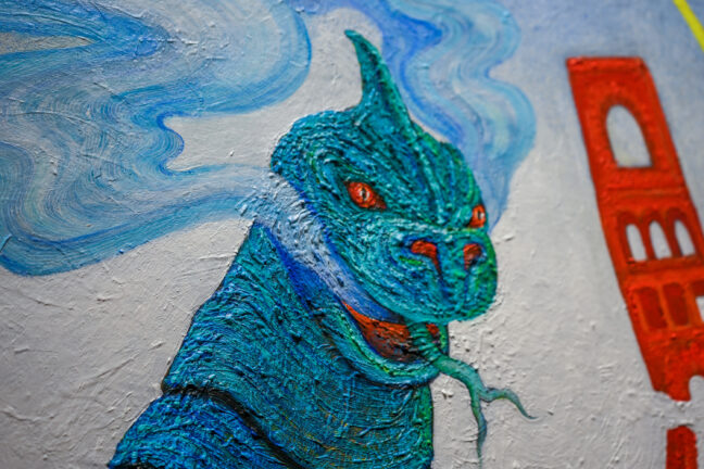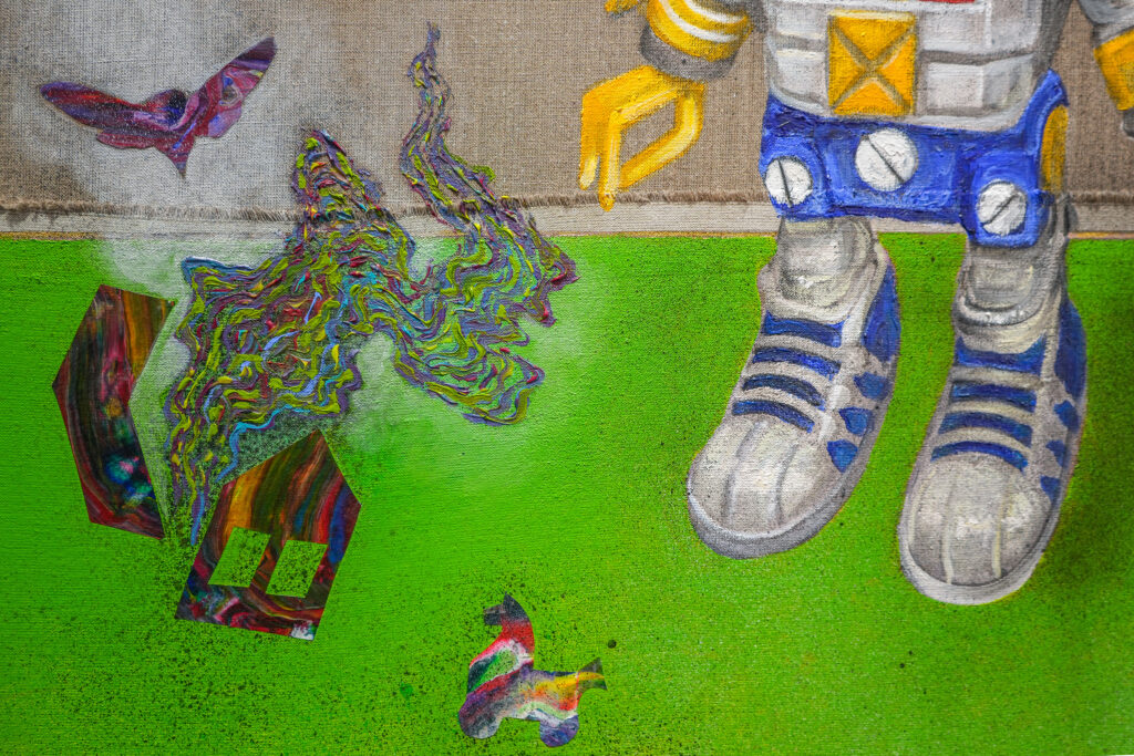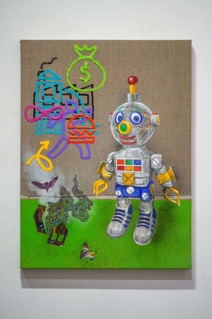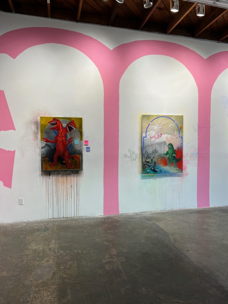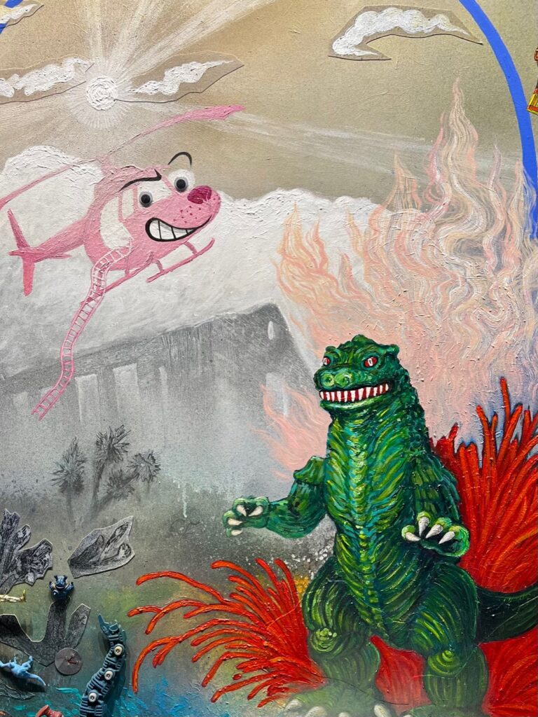 Referencing the often harsh reality of the Southern California landscape – from wildfires to climate change, as well as the rubble of war, and the personification of ourselves, our battles, and our hopes and fears, the visual subject may be toys, but the themes are much deeper. Godzilla, clear plastic robots, an accordian-playing monkey clown, and more fill canvasses as intricate, ominous and absorbing as any dark fairy story. The brilliant pinks, greens, oranges, and blues belie clouds of smoke and broken buildings.