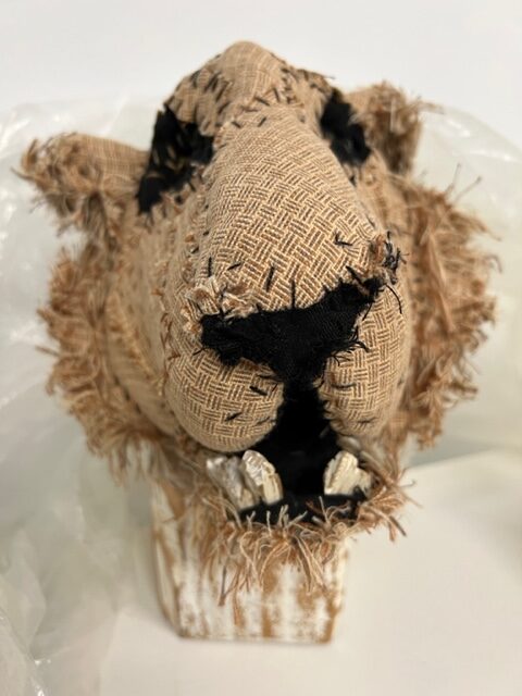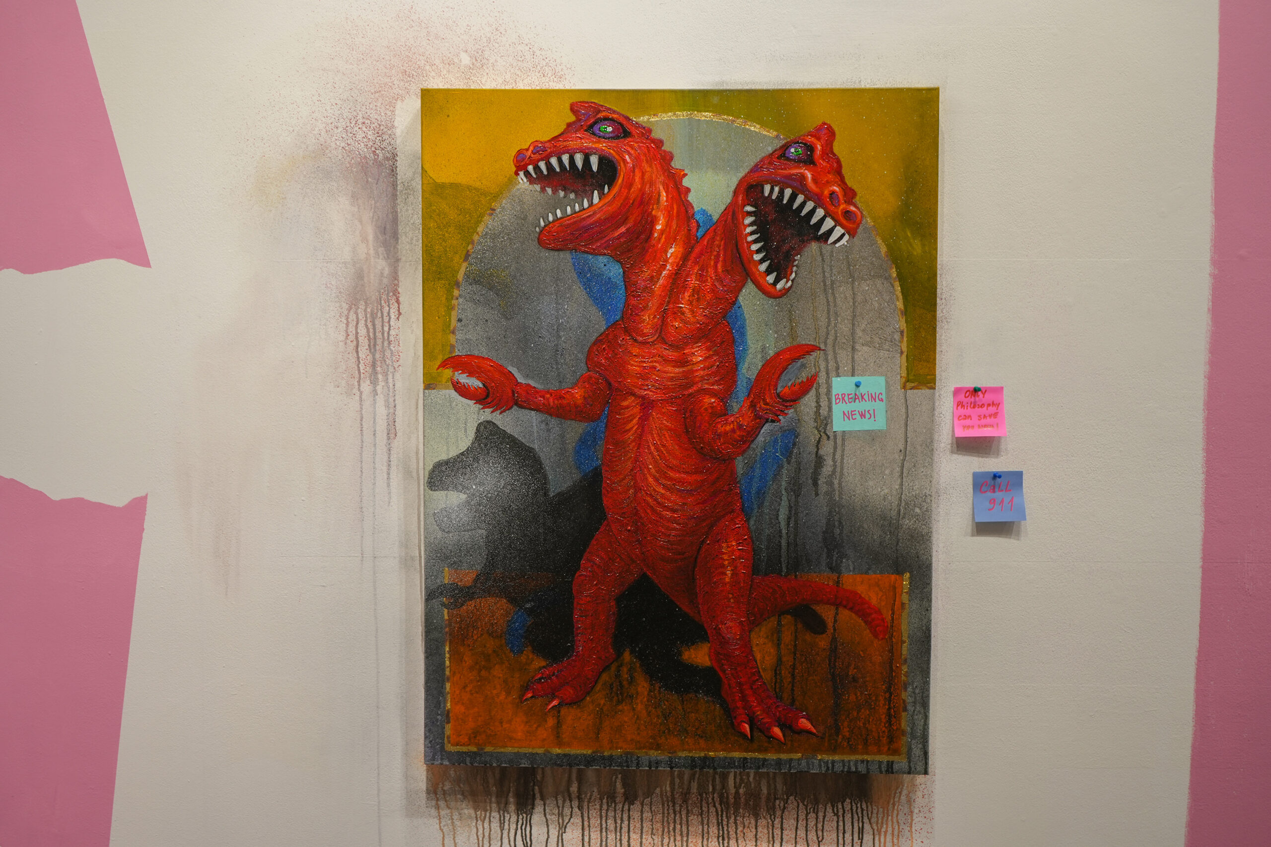 “And now a word from our new spokesperson, Richard, with breaking news” features a two headed red T-Rex monster with a post-it note reading “Breaking News.” Another post-it reads “Only philosophy can save you now.” It’s funny and horrible and true – likely coming soon to TMZ.