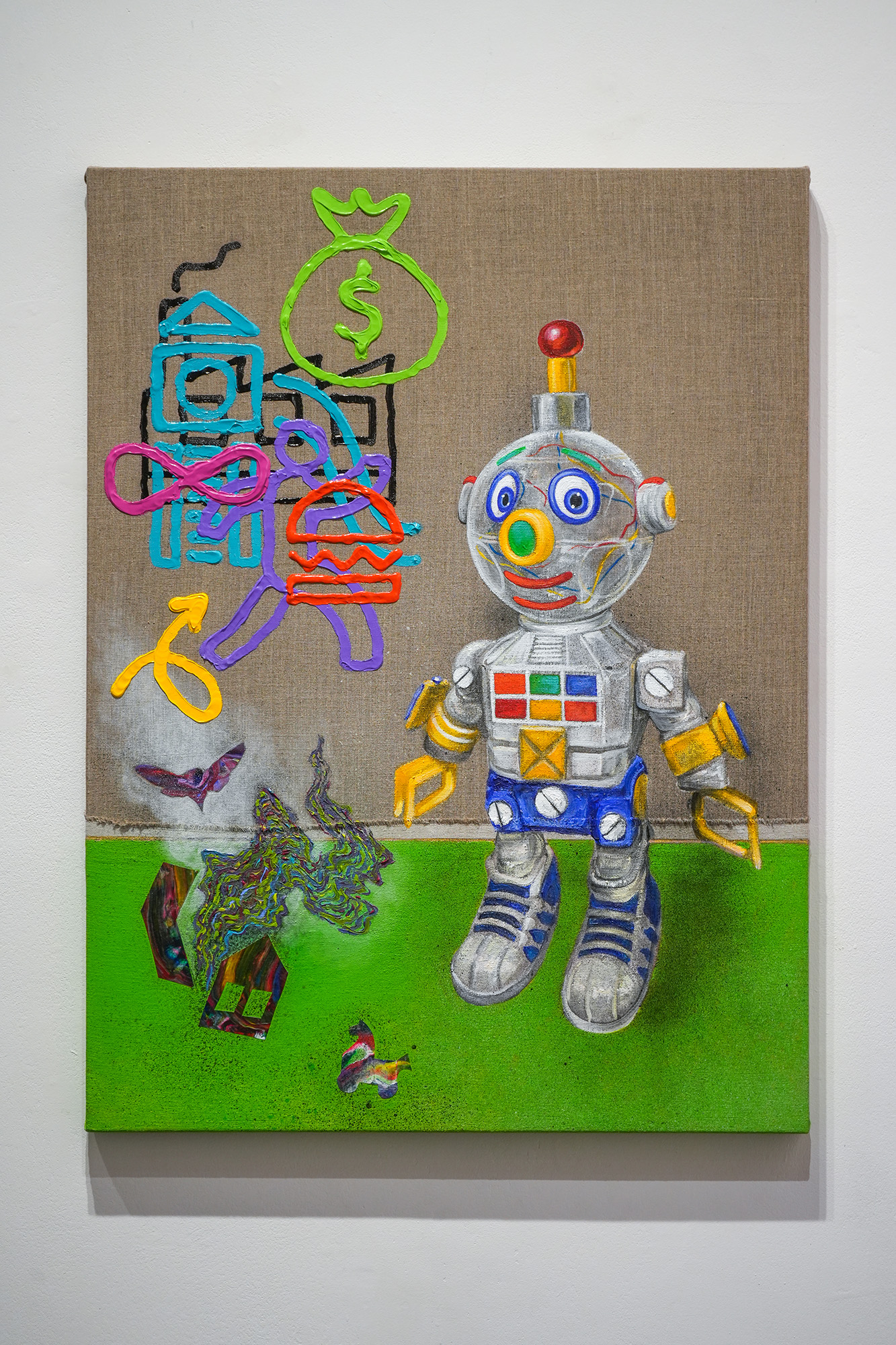 “…and That’s How it Happened,” is a truly wonderful work, in which a grinning clear robot toy looks on at a simply, thickly painted depiction of money going down a housefront that also features a fast-food burger, and a camera. The “end” of this visual story is this: a house broken asunder, a rainbow of dark smoke issuing from it, a bird escaping from it, a small rainbow horse looking on. This disaster may have begun on a child’s playground, but it concluded in real loss and corporate greed.