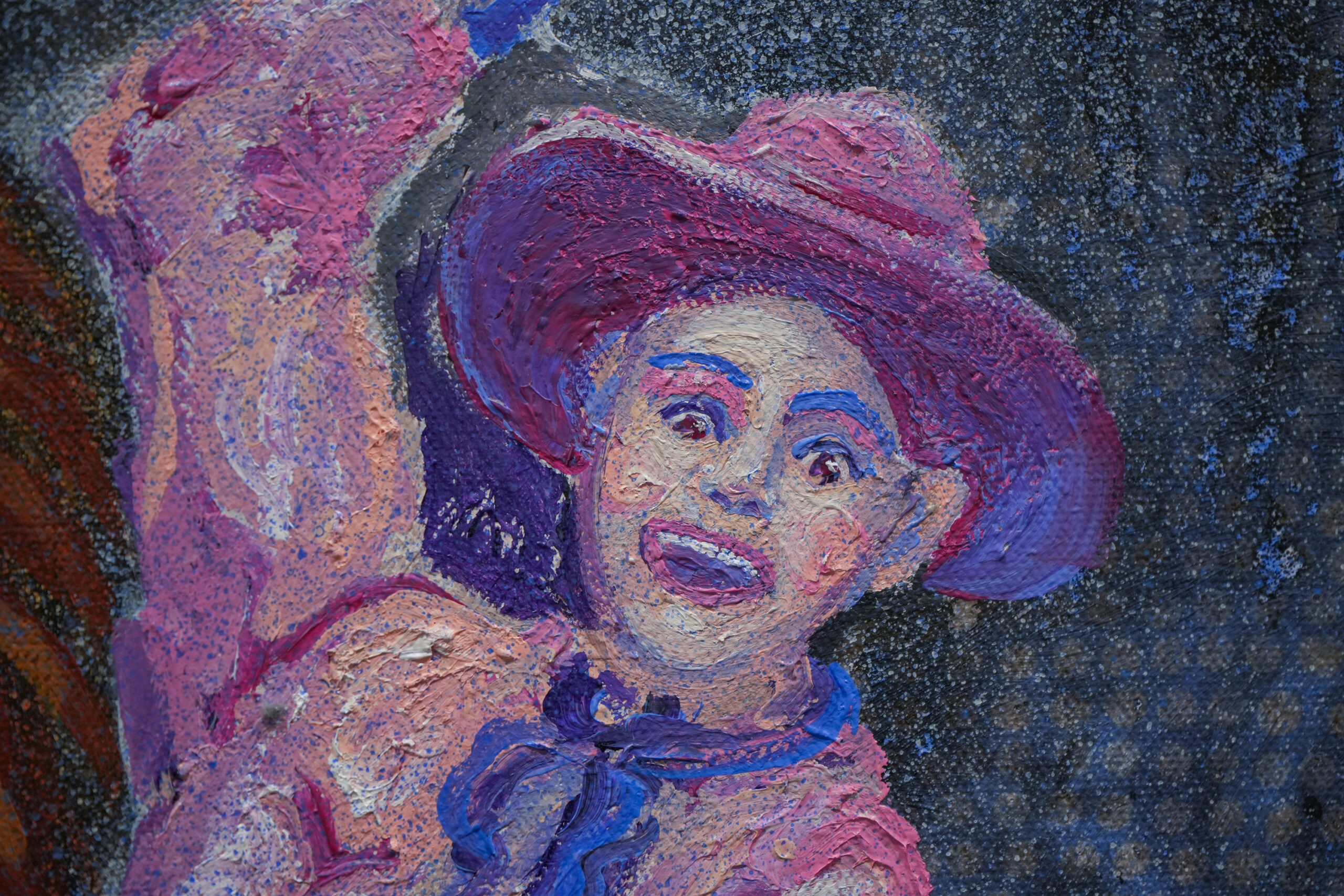 The video itself stars playright and performing poet Robert Patrick, in a tour de force performance singing and reciting his own poems and excerpts from an unpublished play. Whether viewers start with this experience or conclude their visit to the gallery with a view, it serves as a perfect background to the acrylic paintings in the main room.