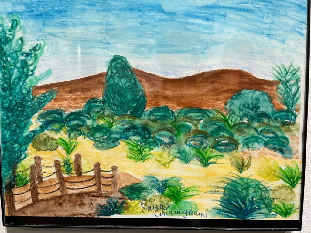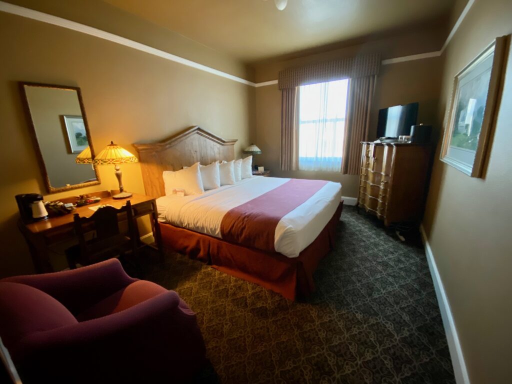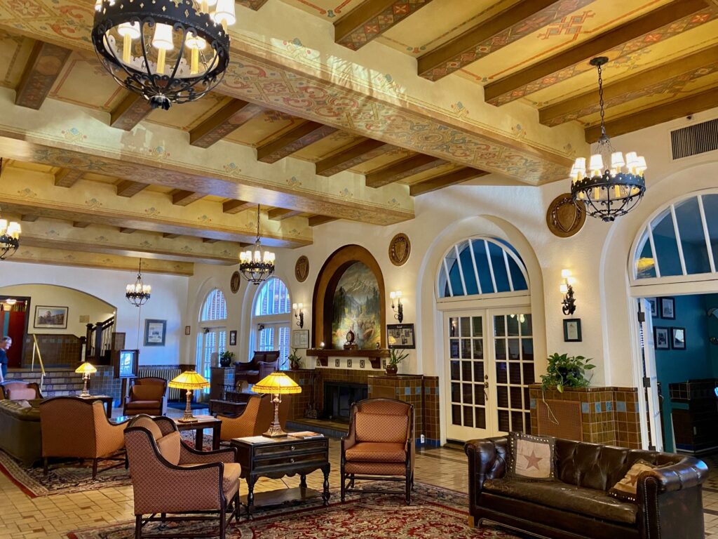 Just as it once drew luminaries such as Georgia O’Keefe and Will Rogers, it certainly drew us. The rooms are charming and offer modern comforts – a terrific mattress, flat screen TV, and good Internet, too. Cozy and well appointed, offering features such as a soft carpet with Native American patterning, burnished wood furnishings, deep maroon duvet and arm chairs, the rooms are also quiet – we did not hear our neighbors once.
