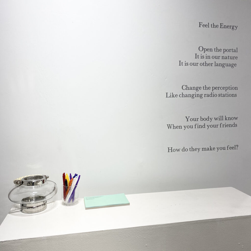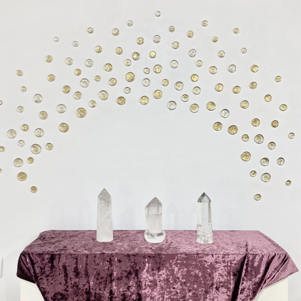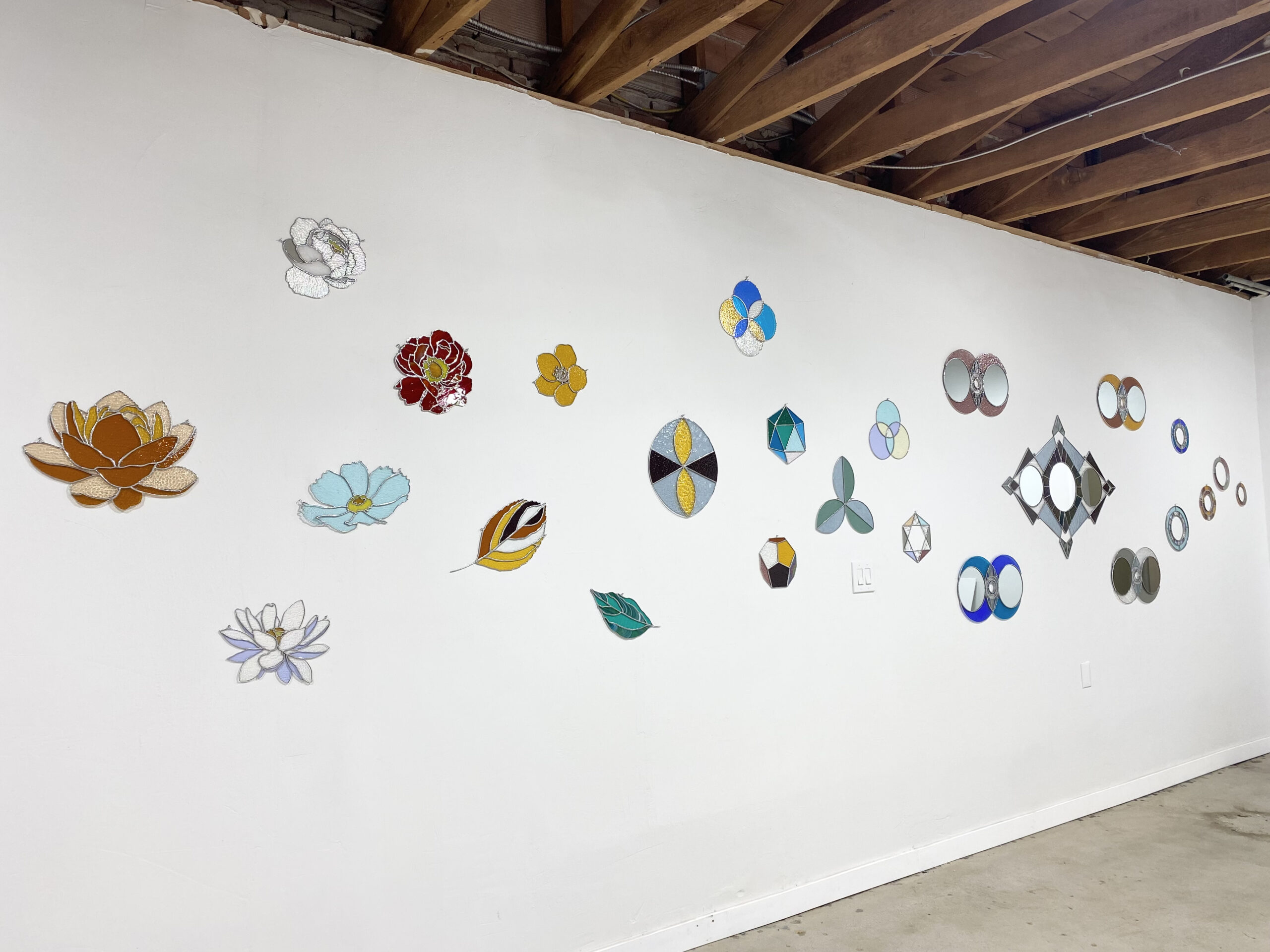 Yamamoto says her work for The Altar is comprised of three major wall installations with multiple pieces involved in each. “I have been shifting my ideas to think about the function of art, and why it exists. I am here to create an experience where the viewer is a real part of the show, where the viewer completes the show.” She adds, “I was really focused on creating a whole new coherent space, making new work made just for the gallery.” The artist encourages viewers to experience their sixth sense, and engage a connection with inner peace. Works include lustrous lotus flowers, emerald leaves, natural crystals, and representations of candle flame, as well as geometric pieces that evoke representations of the “third-eye” and cosmic intuition.