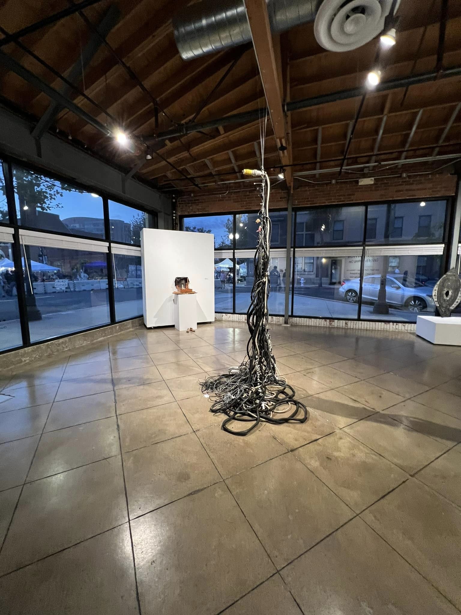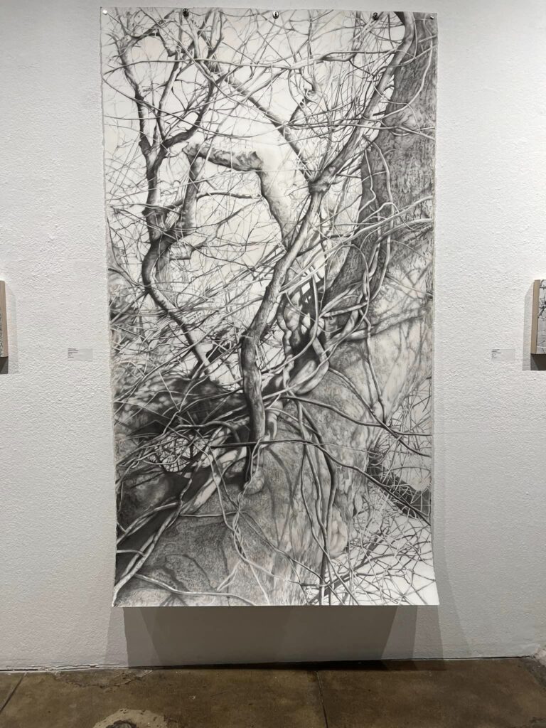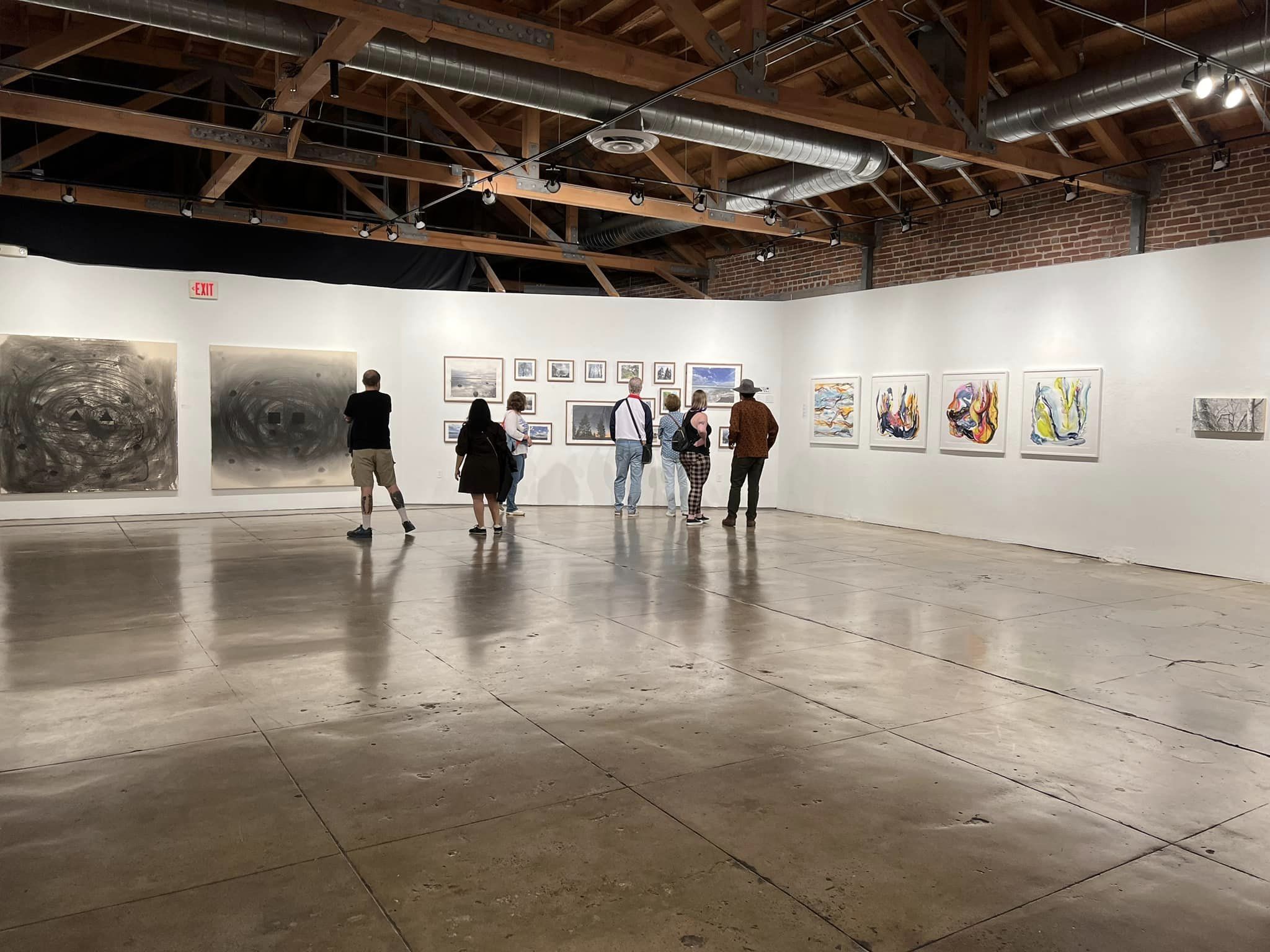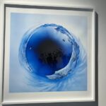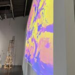 Refetoff’s visionary photographic and projected video images compel and entrance. Producing his first video in over a decade as a large-scale projection, Sea of Change (edited with Juri Koll) offers intense and beautiful images that include drone footage from the near-North-Pole community of Svalbard, California’s Central Valley fracking operations, and images of the distressed Salton Sea, as well as NASA satellite images, and AI prompts based on Refetoff’s own infrared photographic images, projected to imagine future scenarios. The 8 minutes video is both entrancing and heartbreaking, as we contemplate the rising likelihood of planetary change. Refetoff also created his first sculpture, representing potential projected rise in sea level at Santa Monica Pier based on the future of human C02 emissions.