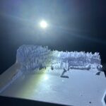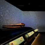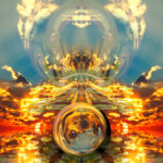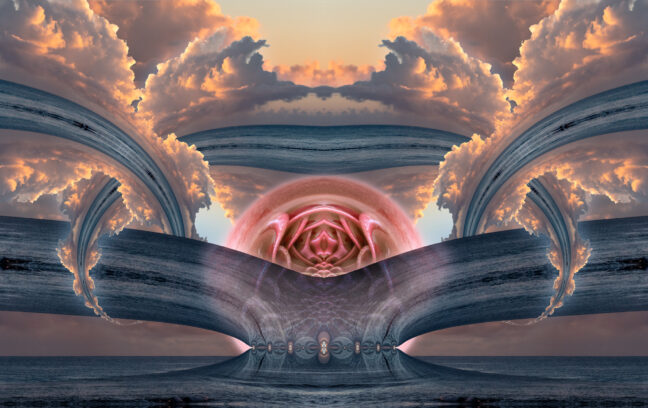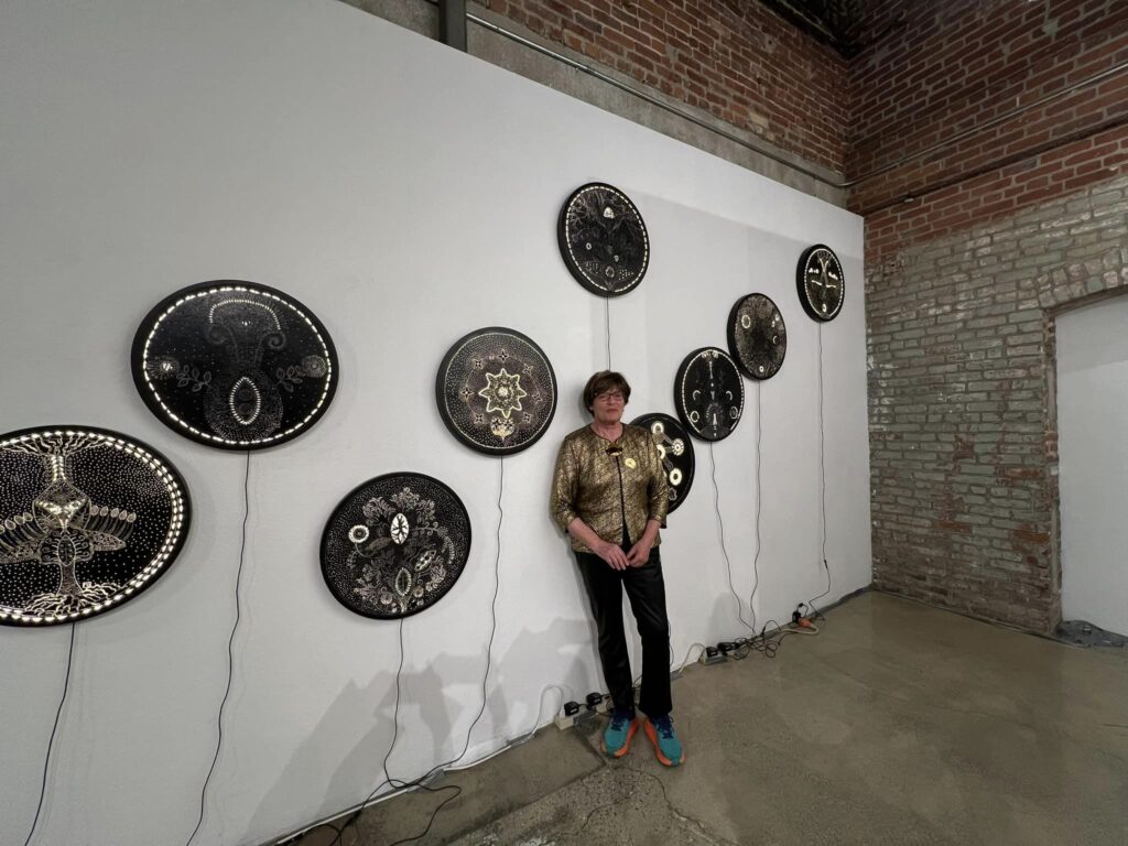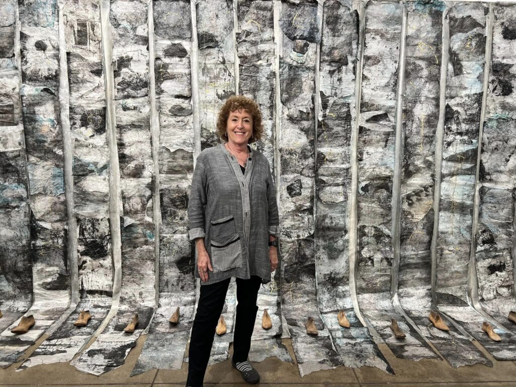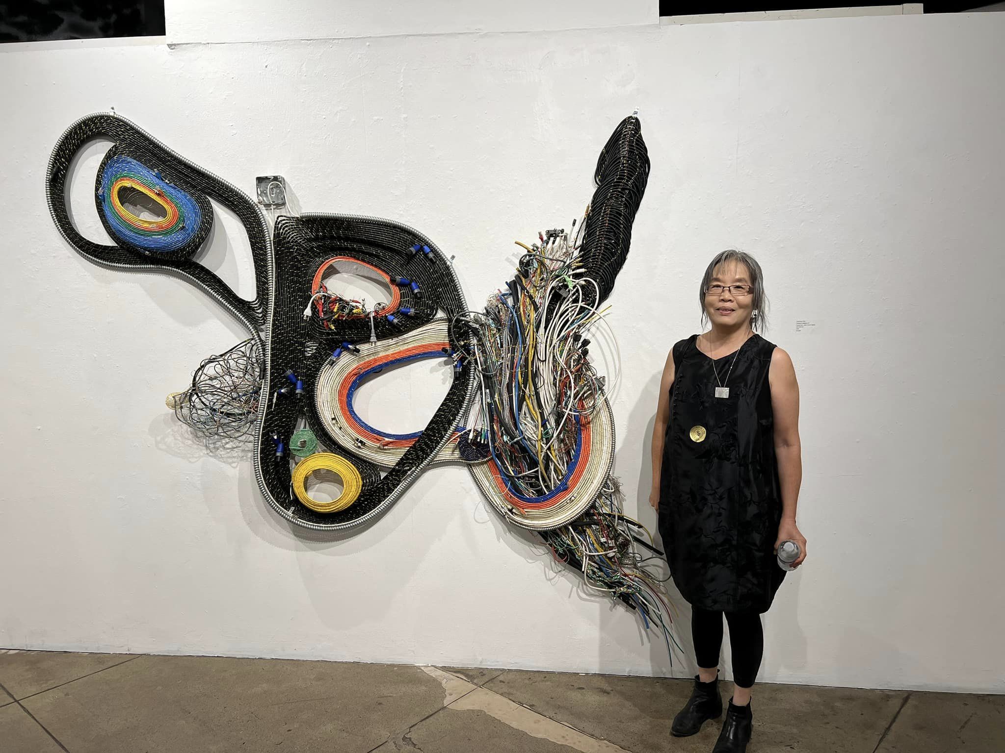Refetoff’s visionary photographic and projected video images compel and entrance. Producing his first video in over a decade as a large-scale projection, Sea of Change (edited with Juri Koll) offers intense and beautiful images that include drone footage from the near-North-Pole community of Svalbard, California’s Central Valley fracking operations, and images of the distressed Salton Sea, as well as NASA satellite images, and AI prompts based on Refetoff’s own infrared photographic images, projected to imagine future scenarios. The 8 minutes video is both entrancing and heartbreaking, as we contemplate the rising likelihood of planetary change. Refetoff also created his first sculpture, representing potential projected rise in sea level at Santa Monica Pier based on the future of human C02 emissions.