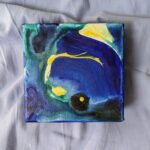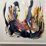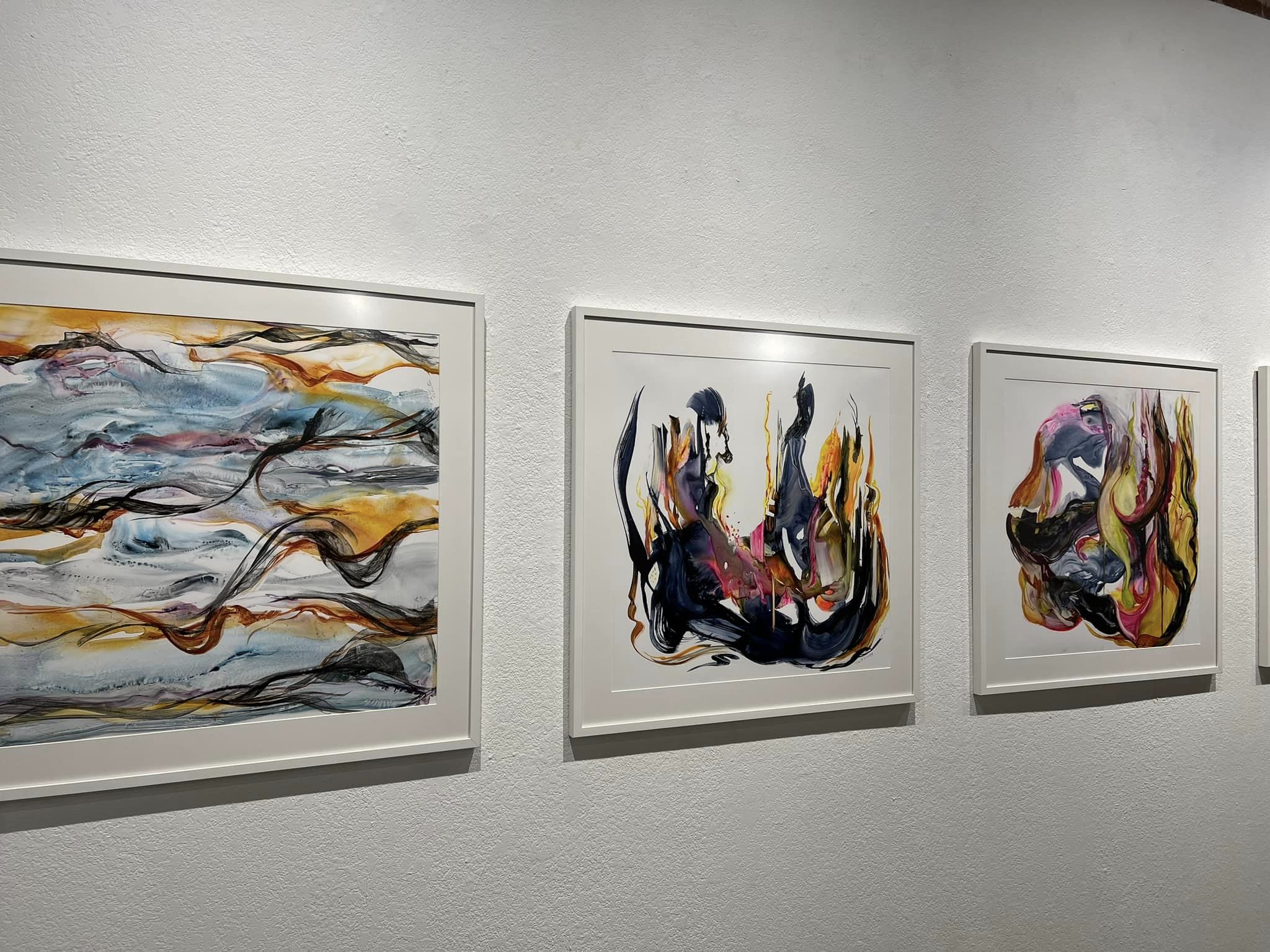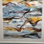 Taking a direction new to this viewer, Rick offers a series of trapeze artists, in her series “The Fliers #1-#4.” Here pale, almost abstract figures outlined in a gold/pale mustard shade reach for, connect, or glide past each other on aerial rigging. There is the quality of a dream about this work – but all her work here is dreamy – disconnected from a known reality, it suggests our ability to tenaciously, with assistance, take to the sky the artist so admires.