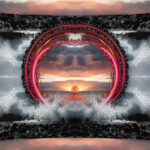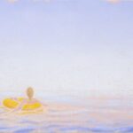 “The Golden Sun” is just that, with a small figure bobbing on a surfboard, watching a bold pink sky slowly fade. “Fly” is also a pink and gold gem, as an airplane comes into a pink LA surrounded by palms; while “Good” is a view of homecoming as seen from a plane, the grand grid of lights below an airplane window spread out against a fine canopy of Cerulean blue. “Distant Light” is a shimmery, mirage like view of distant houses, illuminated against a shoreline.