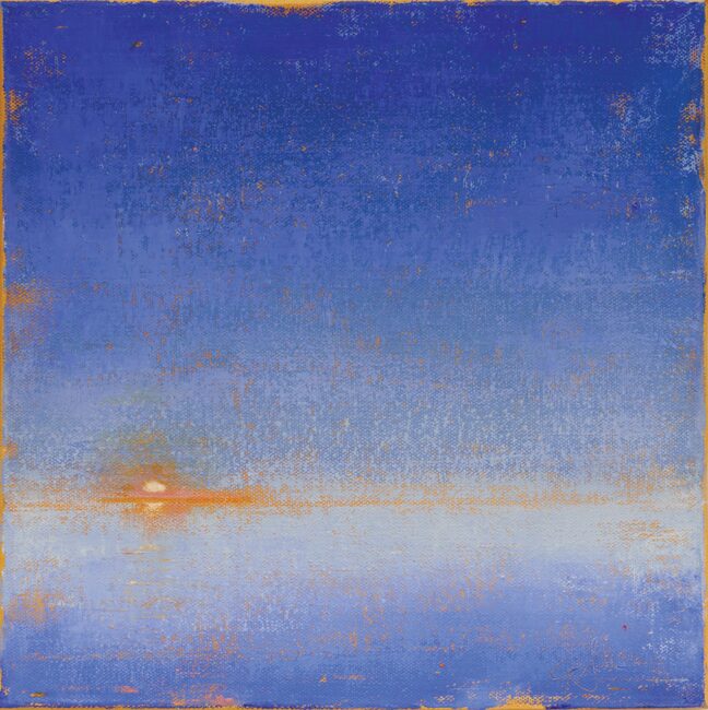 At bG Gallery, Gay Summer Rick’s glorious color palette and precise oil painting using palette knife morphs the impressionistic form with a gauzy realism of seascape and landscape. Lighter Than Air, her latest series of richly rewarding works, glow with Southern California light. The transcendence that light creates is the force within her work, which here touches on the lyrical and metaphysical as well as the contours of the coast. “Somewhere Above” is a burst of golden sky reflecting on cloud or water, Heaven as a visual portal, perhaps. “Buoyant” gives us a woman floating on a yellow inner tube against a sun-kissed sea, an almost child-like bliss. “Cadence” offers a pale periwinkle sea suffused with bits of pink light, the pink line of the horizon or a distant shore all a-glow.