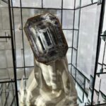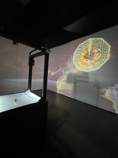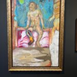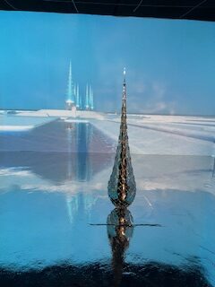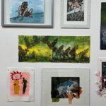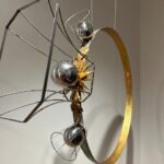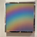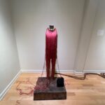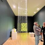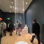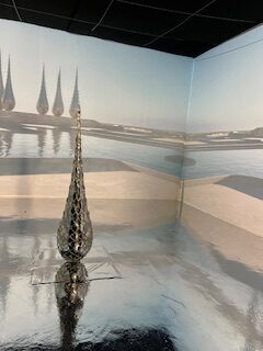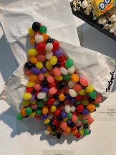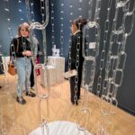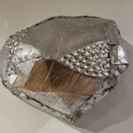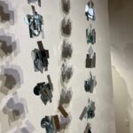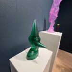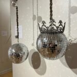 Daub’s work is as whimsical as it is gorgeous. Giant gemstones, disco galls wearing crowns, a ring big enough for an elephant’s wedding, and examples of the artist’s wearble jewelry are all on display. All that glitters is gold here – or silver, mirror, and glass.