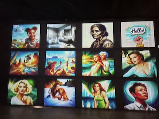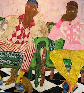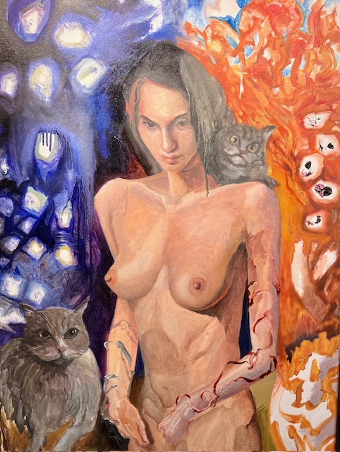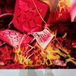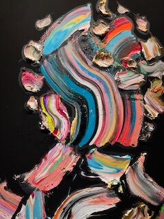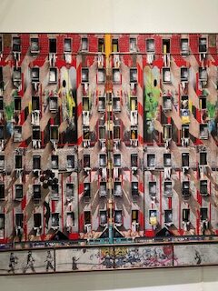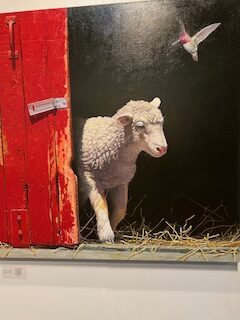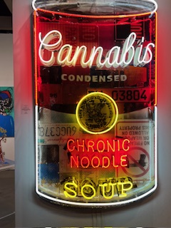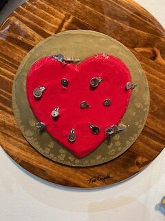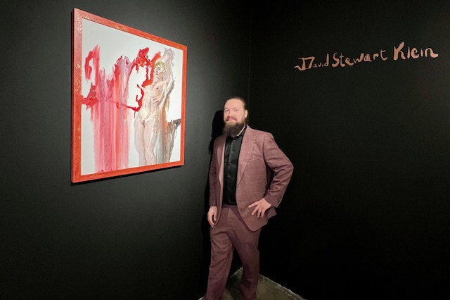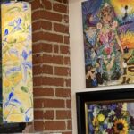 Kyla Hansen’s neon-ribboned “Psychic” and Rosson Crow’s spray paint, oil, and acrylic rhapsody in reds, “Proud to be an American” are among the standouts.