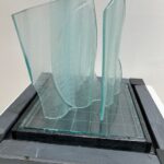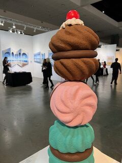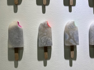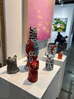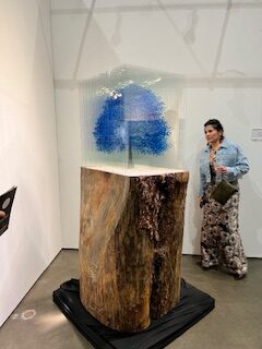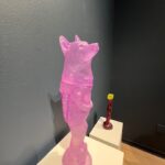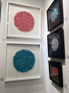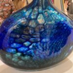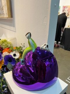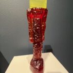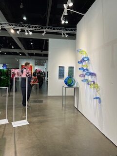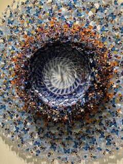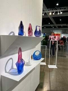 In the group show, the artists create works that defy traditiona expectations of glass art, creating unique and fascinating works from a column of linked glass “paper clip” chains to neon infused fabric daisies. Seashells, sea foam, stained glass, and figurative works all dazzle as do the art deco stylings of Nao Yamamoto.