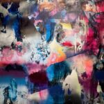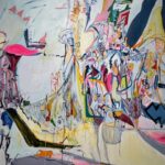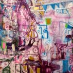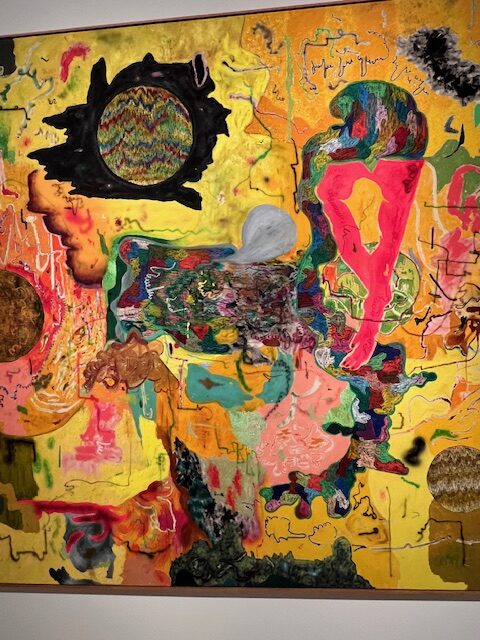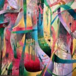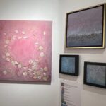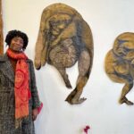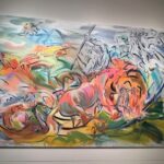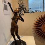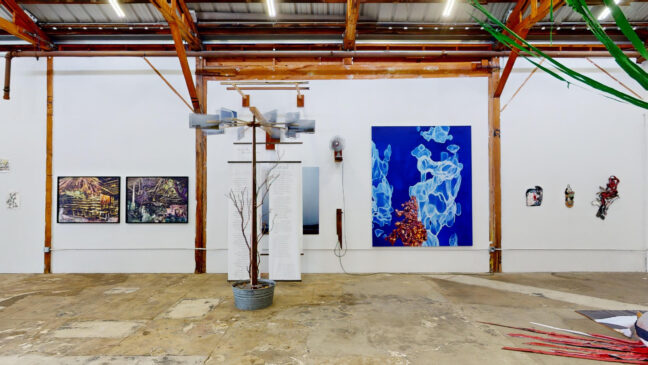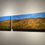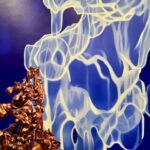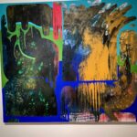 The sinuous forms of Washington’s work are created with natural pigment, but it is their line and terrific aliveness that most captivates. Her “In the Field the Basket Feels” is a stunning work. Along with Brewer’s seemingly interplanetary floral ceramics, there is his vibrant blue and copper hued painting positioned opposite Washington’s, creating a contrasting and compelling shift in color palette.