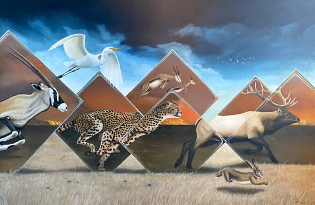 Mare’s work here is dark and intense, particularly her “Ghost in the Machine,” a rich dreamscape painted on aluminum.