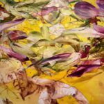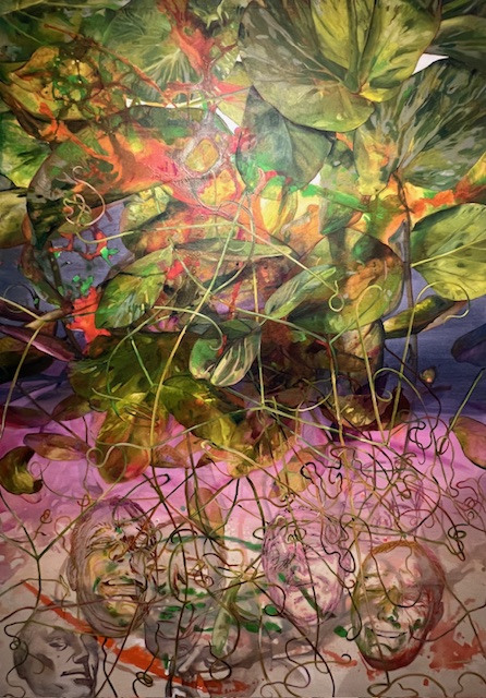 During her many hospital and doctor visits, Lazzari became fascinated with the color imaging of radiology tests, showing the cancer and the energy in her body which eventually led her to move from figuration to abstraction in her work. In the transitional painting “Tendrils,” 2006, acrylic on canvas, she paints vibrant, robust plants, almost looking like water lilies, with smiling faces, barely visible towards the bottom, maybe reflections in water or ghost-like images shining through the water. Perhaps images of the artist herself as she banishes cancer from her body and celebrates.